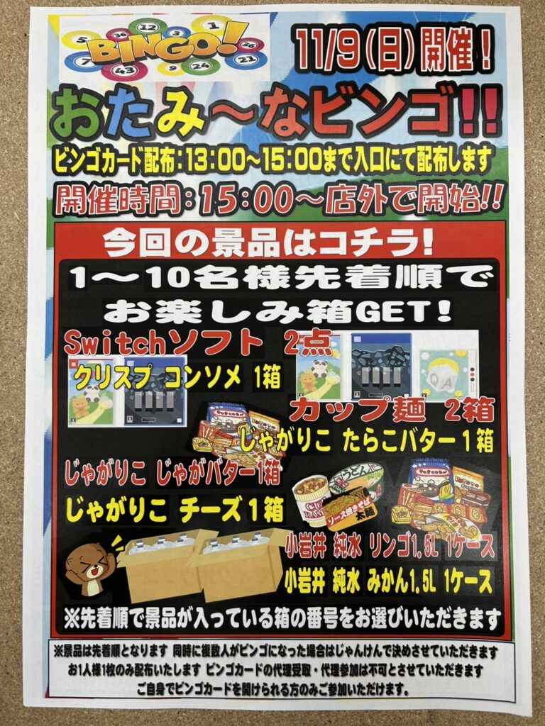 11月9日(日)15時イベント開催 ビンゴ大会をおこないます。 お菓子やジ…