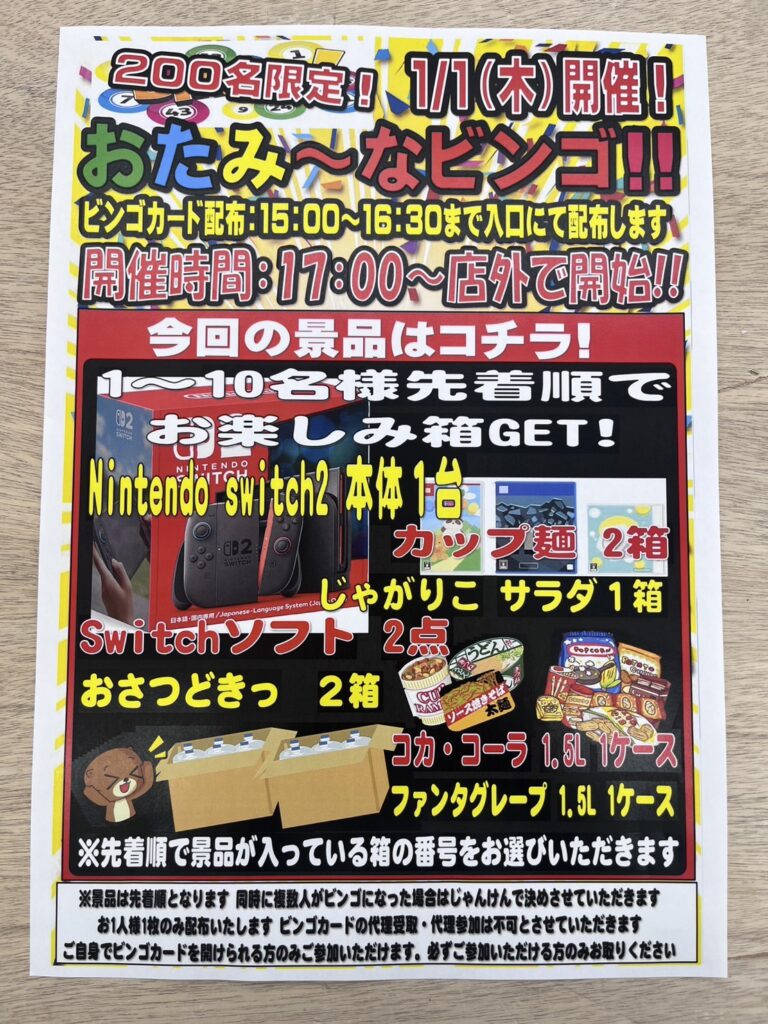 1月1日(木)17時イベント開催 ビンゴ大会をおこないます。 本日はSwitch…