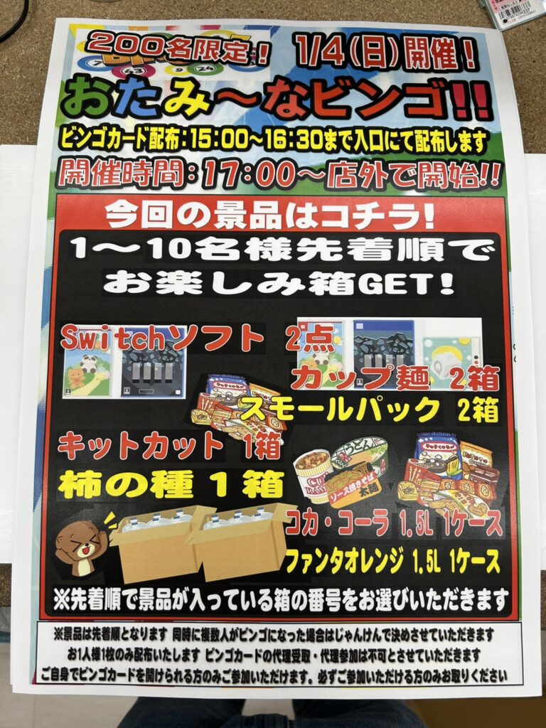 1月4日(日)17時イベント開催 ビンゴ大会をおこないます。 お菓子やジュ…
