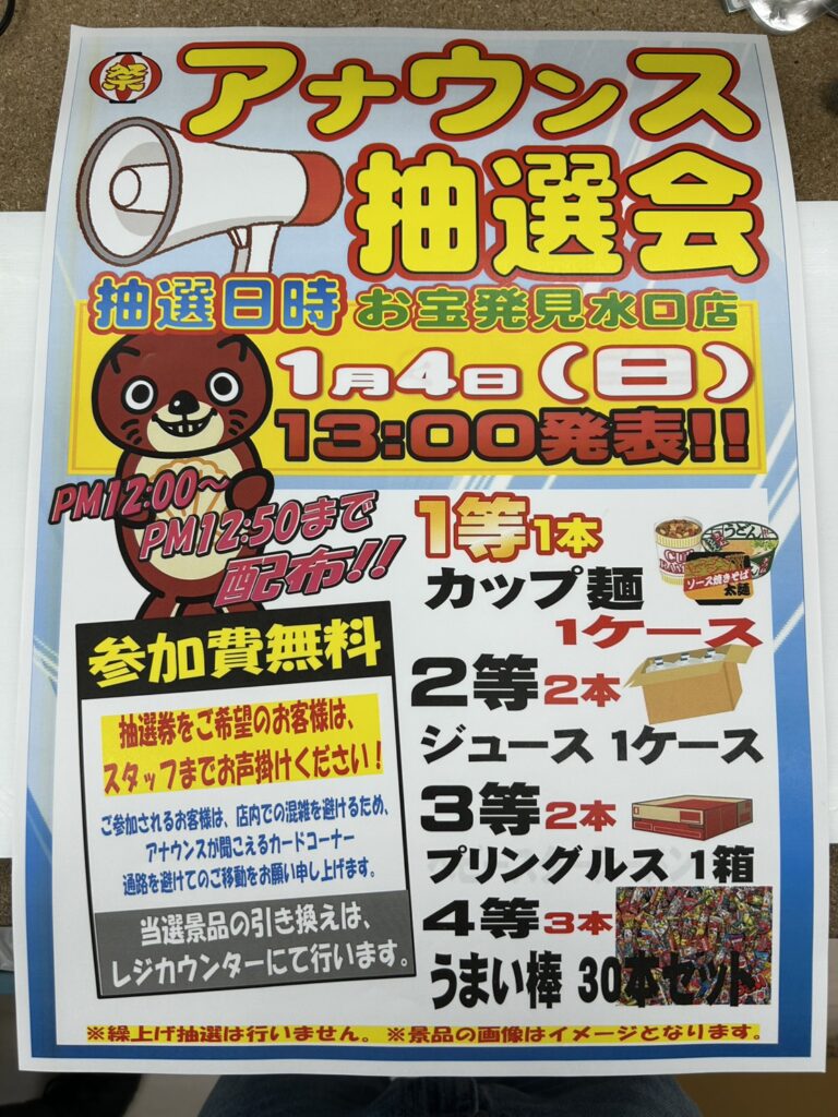 1月4日(日)13時イベント開催 アナウンス抽選会をおこないます。 抽選券…