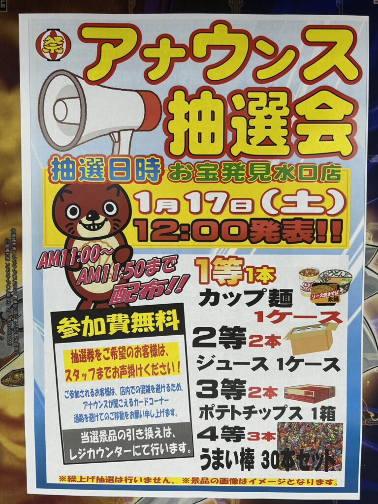 1月17日(土)12時イベント開催 アナウンス抽選会をおこないます。 抽選…