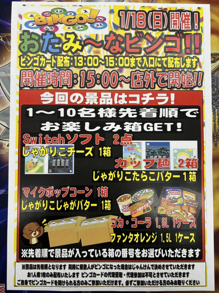 1月18日(日)15時イベント開催 ビンゴ大会をおこないます。 お菓子やジ…
