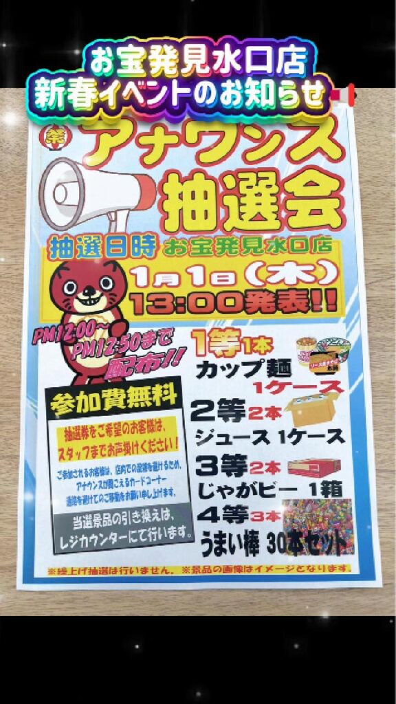 1月1日(木)13時イベント開催 アナウンス抽選会をおこないます。 抽選券…