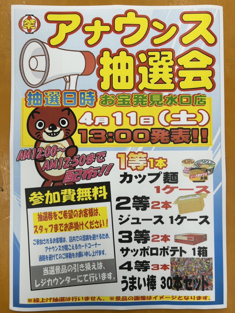 ★4月11日(土)13時イベント開催★ アナウンス抽選会をおこないます! 抽…