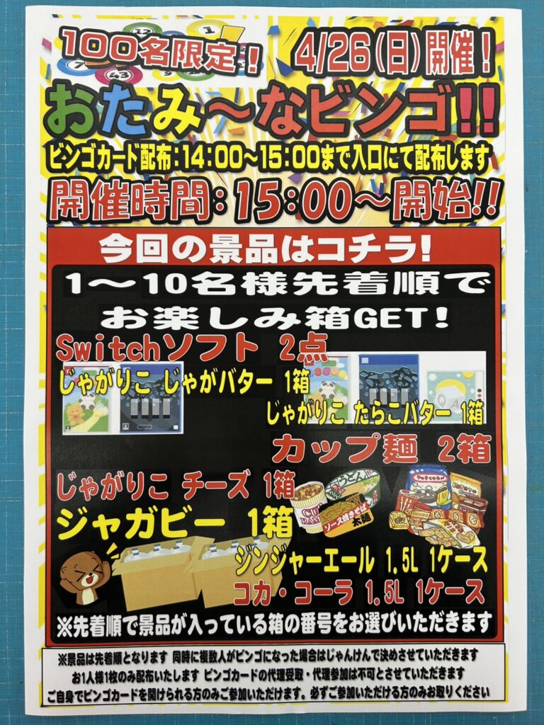 4月26日(日)15時イベント開催 ビンゴ大会をおこないます。 お菓子やジ…