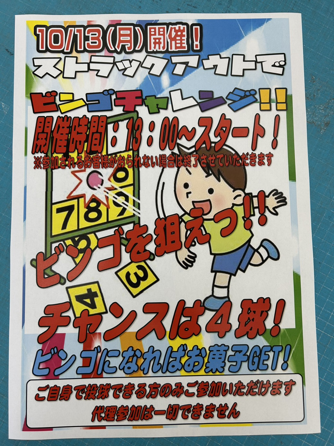 ★本日10月13日(月)13時ストラックアウトビンゴチャレンジ大会★