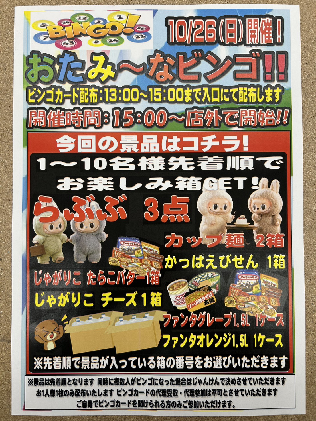10月26日(日)15時イベント開催! NEW イベント 2025年10月24日 10月26日(日)15時イベント開催 ビンゴ大会をおこないます。 お菓子やジュース等の 景品をご用意しております。 皆様のご来店お待ちしております