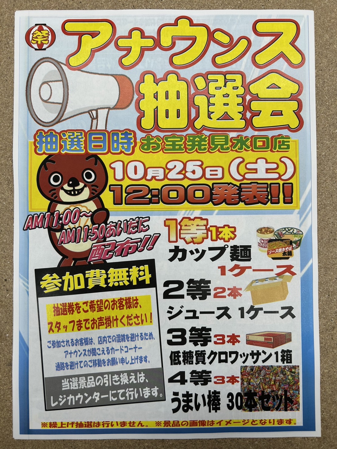 ◆《10月25日》アナウンス抽選会をおこないます!◆ NEW イベント 2025年10月25日 ★10月25日(土)12時イベント開催★ アナウンス抽選会をおこないます! 抽選券の配布は 11時~レジにて配布いたします。 豪華景品をご用意しておりますので皆様のご来店お待ちしております ************************ こちら↓もぜひチェックしてみてくださいね♪(*´▽`*) ・最新のイベント情報はこちら ・最新の買取情報はこちら