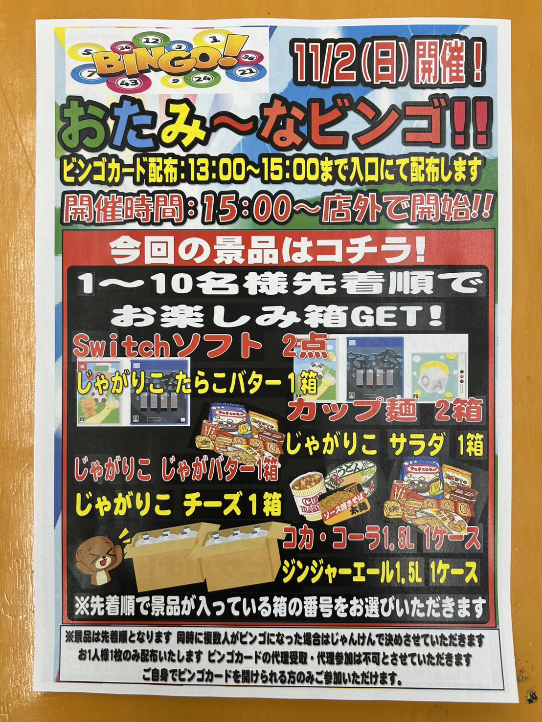 11月2日(日)15時イベント開催 ビンゴ大会 NEW イベント 2025年11月1日 11月2日(日)15時イベント開催 ビンゴ大会をおこないます。 お菓子やジュース等の 景品をご用意しております。 皆様のご来店お待ちしております ************************ こちら↓もぜひチェックしてみてくださいね♪(*´▽`*) ・最新のイベント情報はこちら ・最新の買取情報はこちら