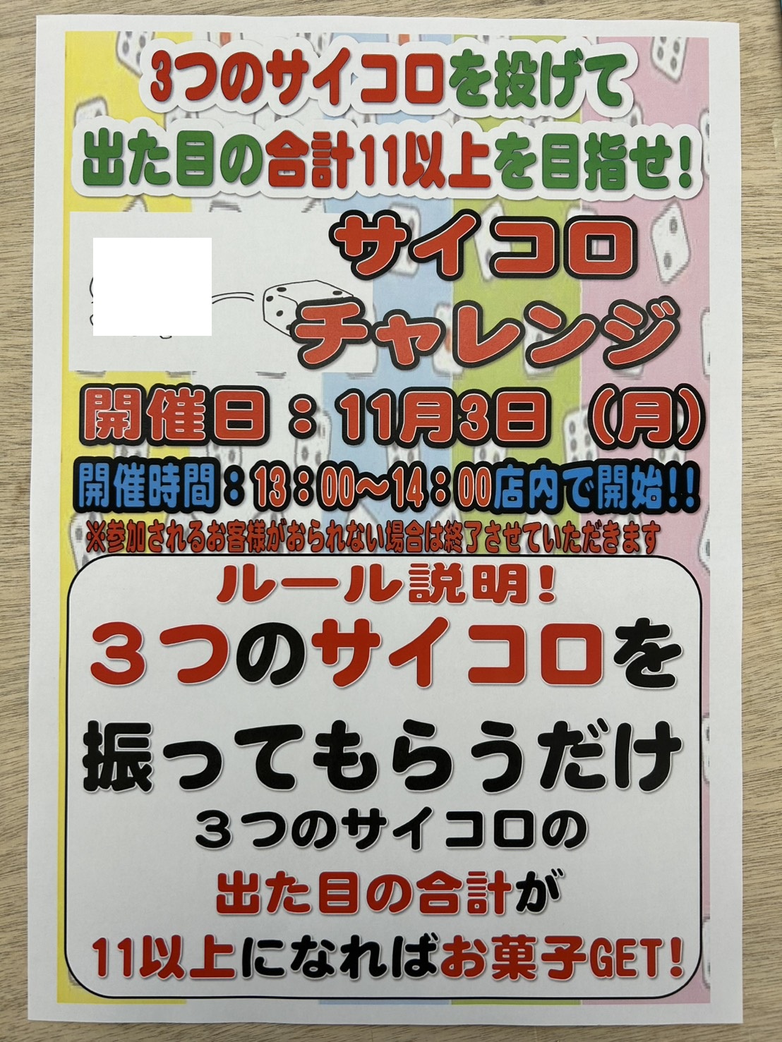 ☆★《11月3日(月)13時から開催》サイコロチャレンジ★☆ NEW イベント 2025年11月3日 11月3日(月)13時からイベント開催 サイコロチャレンジをおこないます🎲 サイコロを3つ振って出た目の合計が11以上になれば 景品GET皆様のご来店お待ちしております ************************ こちら↓もぜひチェックしてみてくださいね♪(*´▽`*) ・最新のイベント情報はこちら ・最新の買取情報はこちら
