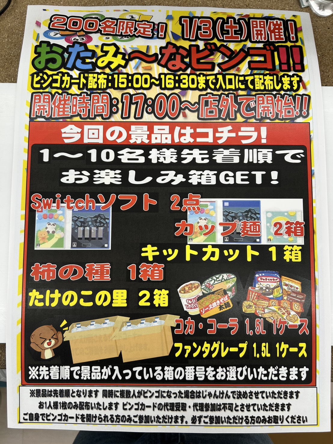 1月3日(土)17時イベント開催 ビンゴ大会をおこないます。
