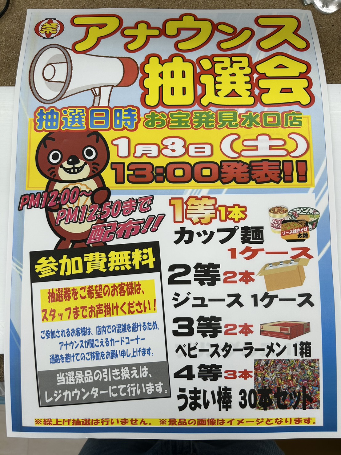1月3日(土)13時~ アナウンス抽選会をおこないます! NEW イベント 2026年1月3日 1月3日(土)13時イベント開催 アナウンス抽選会をおこないます。 抽選券の配布は 12時~レジにて配布いたします。 豪華景品をご用意しておりますので皆様のご来店お待ちしております! ************************ こちら↓もぜひチェックしてみてくださいね♪(*´▽`*) ・最新のイベント情報はこちら ・最新の買取情報はこちら