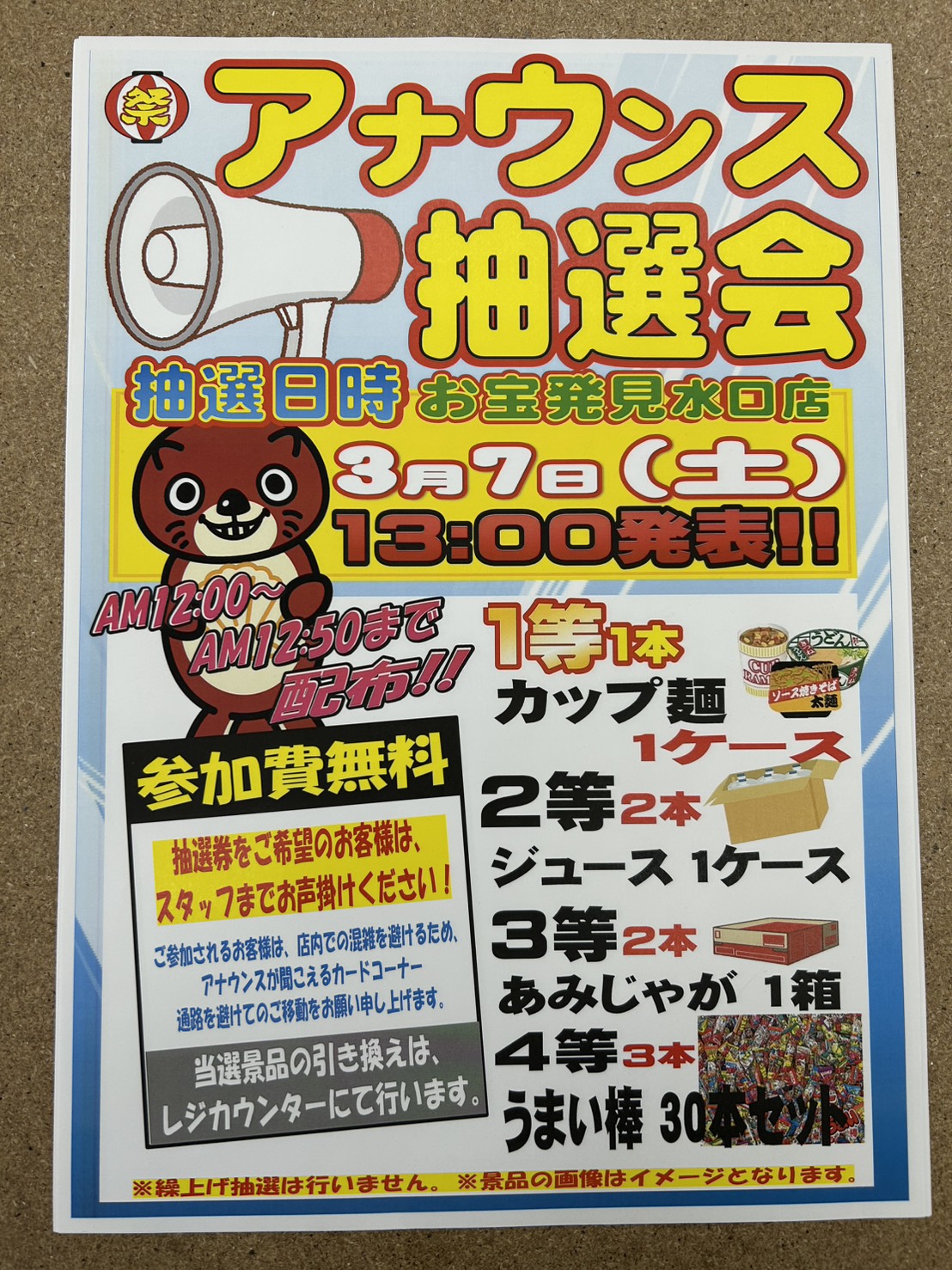 12時~レジにて配布いたします。豪華景品をご用意しておりますので