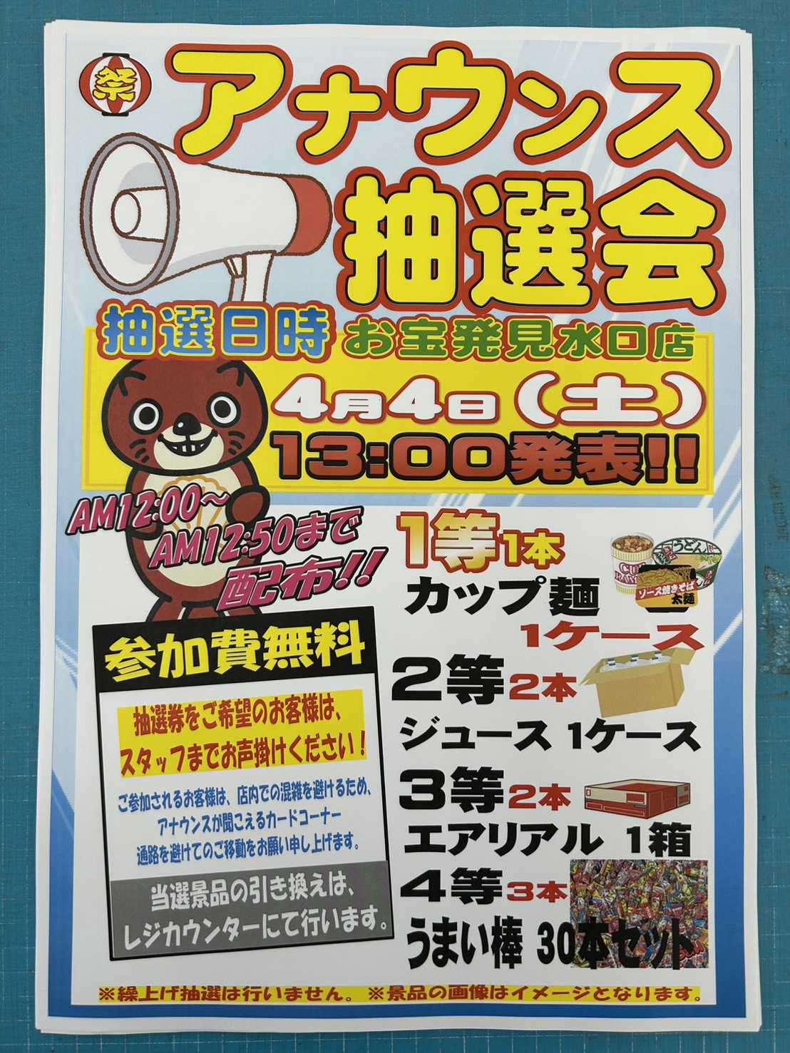 12時~レジにて配布いたします。豪華景品をご用意しておりますので