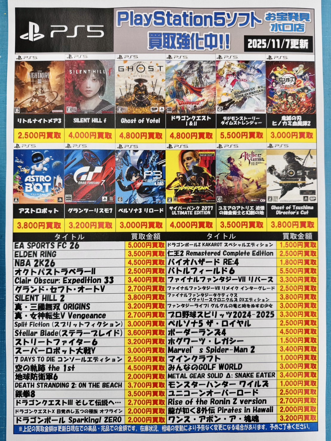 PS5ソフトの買取価格を更新しました! NEW 買取告知 ゲーム 2025年11月7日 PS5ソフトの買取価格を更新しました!🪿🍁 ※2025/11/7現在の価格となります。 在庫状況などによってお値段が変動いたします。予めご了承ください。 ************************ こちら↓もぜひチェックしてみてくださいね♪(*´▽`*) ・最新のイベント情報はこちら ・最新の買取情報はこちら