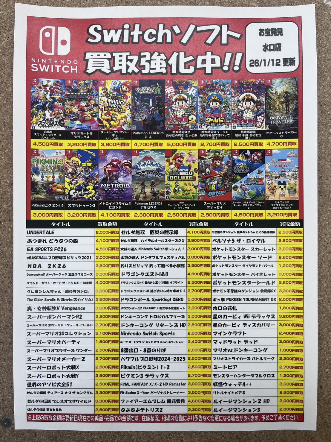 Switchソフト買取価格更新しました! 買取告知 ゲーム 2026年1月13日 Switchソフト買取価格更新しました🎮 ※2026/1/13現在の価格となります。 在庫状況などによってお値段が変動いたします。予めご了承ください。 ************************ こちら↓もぜひチェックしてみてくださいね♪(*´▽`*) ・最新のイベント情報はこちら ・最新の買取情報はこちら