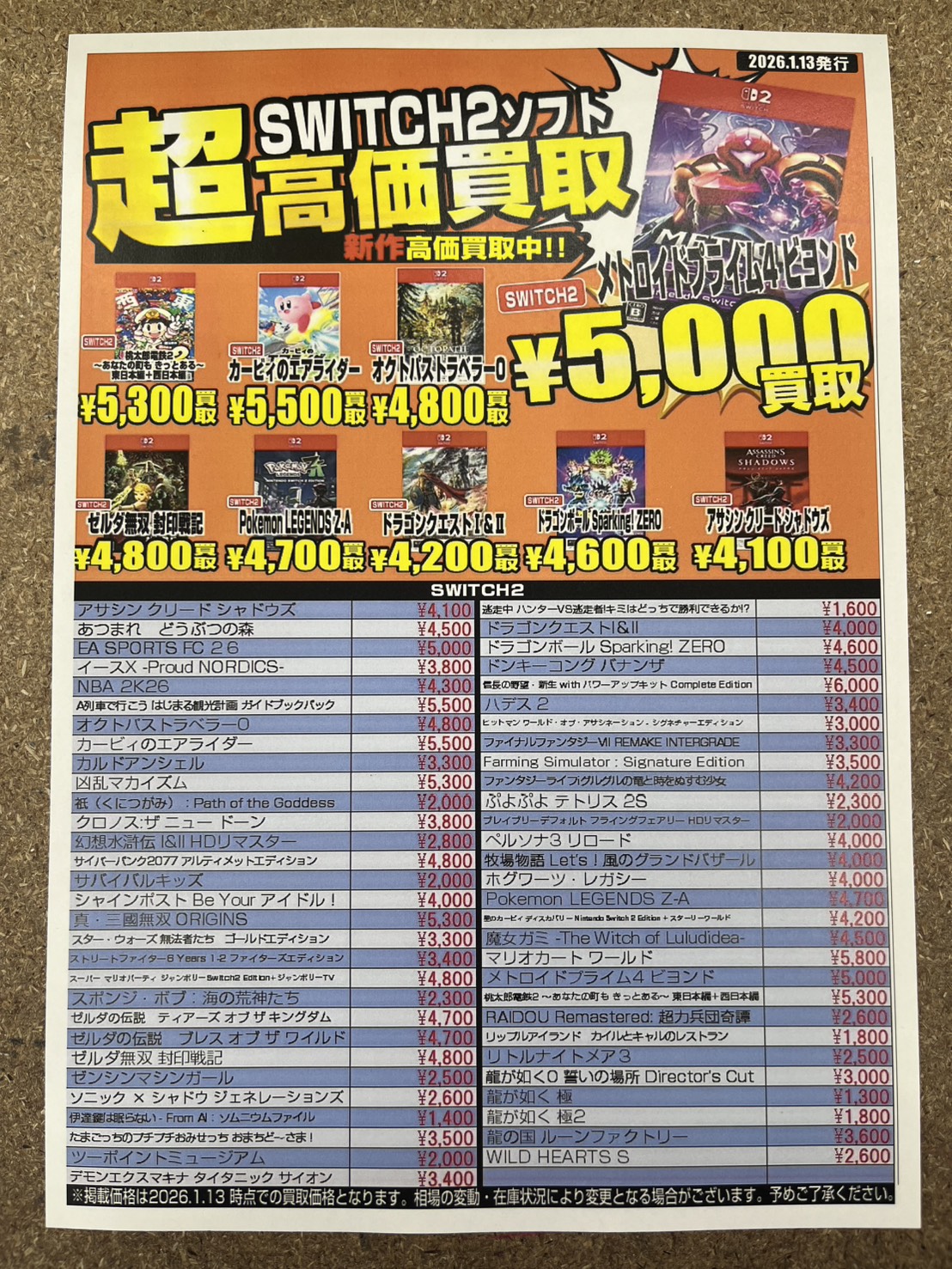 Switch2ソフト、PS5ソフトの買取価格を更新しました✨ 買取告知 ゲーム 2026年1月13日 Switch2ソフト、PS5ソフトの買取価格を更新しました✨ ※2026/1/13現在の価格となります。 在庫状況などによってお値段が変動いたします。予めご了承ください。 ************************ こちら↓もぜひチェックしてみてくださいね♪(*´▽`*) ・最新のイベント情報はこちら ・最新の買取情報はこちら