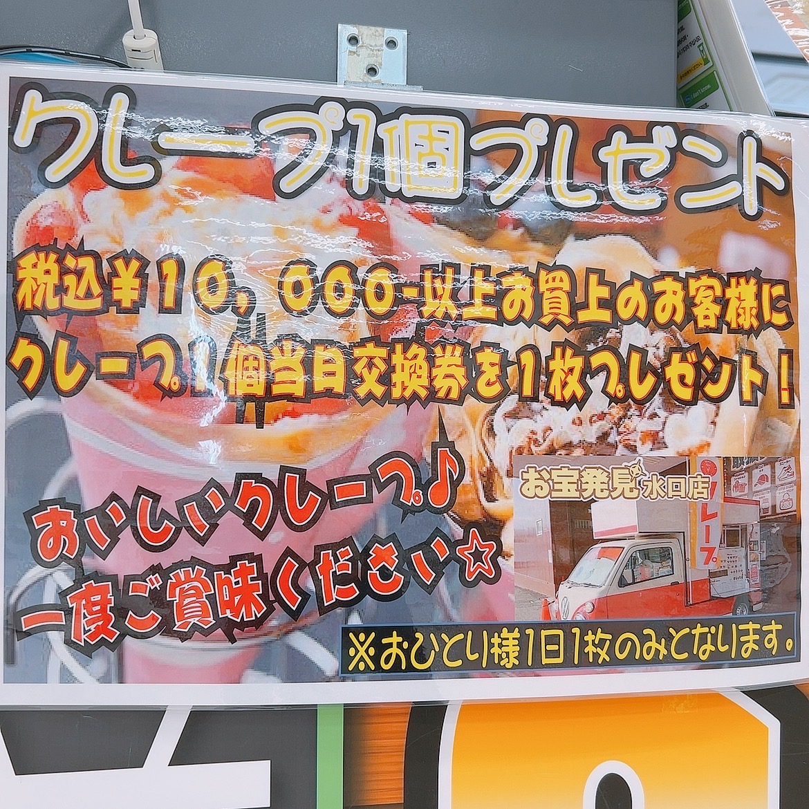 🍓🍌11/1(土)クレープ屋さん来店中✨ お知らせ 2025年11月1日 🍓🍌11/1(土)クレープ屋さん来店中✨ 夕方18時頃までのご来店です🌟 スタッフのオススメは 期間限定のおいもさん🍠💕 店内は飲食禁止🚫 となっておりますので お帰りの際にぜひ一度 お立ち寄りください💖 また、本日当店のお買い物 税込10,000円以上で クレープ1個無料券を プレゼント🎁🧸 皆様のご来店 お待ちしております🕊️✨ {} {} {}