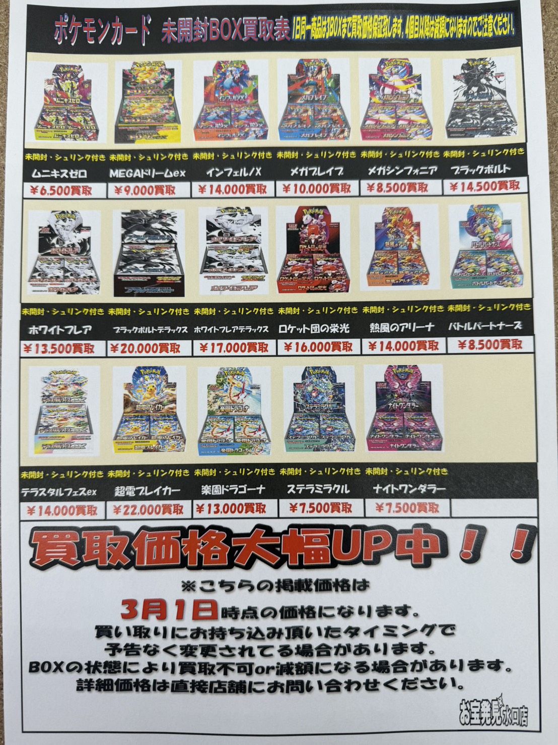 ポケモンカードカードBOX買取リスト更新しました! 買取商品 買取告知 2026年3月1日 数量限定で買取価格大幅UP中!! 個数が集まり次第掲載価格は終了します。 お早めにお持ち下さいませ! 当店査定基準に満たない商品は買取不可となります。 ※2026/3/1現在の価格となります。 在庫状況などによってお値段が変動いたします。予めご了承ください。 ************************ こちら↓もぜひチェックしてみてくださいね♪(*´▽`*) ・最新のイベント情報はこちら ・最新の買取情報はこちら