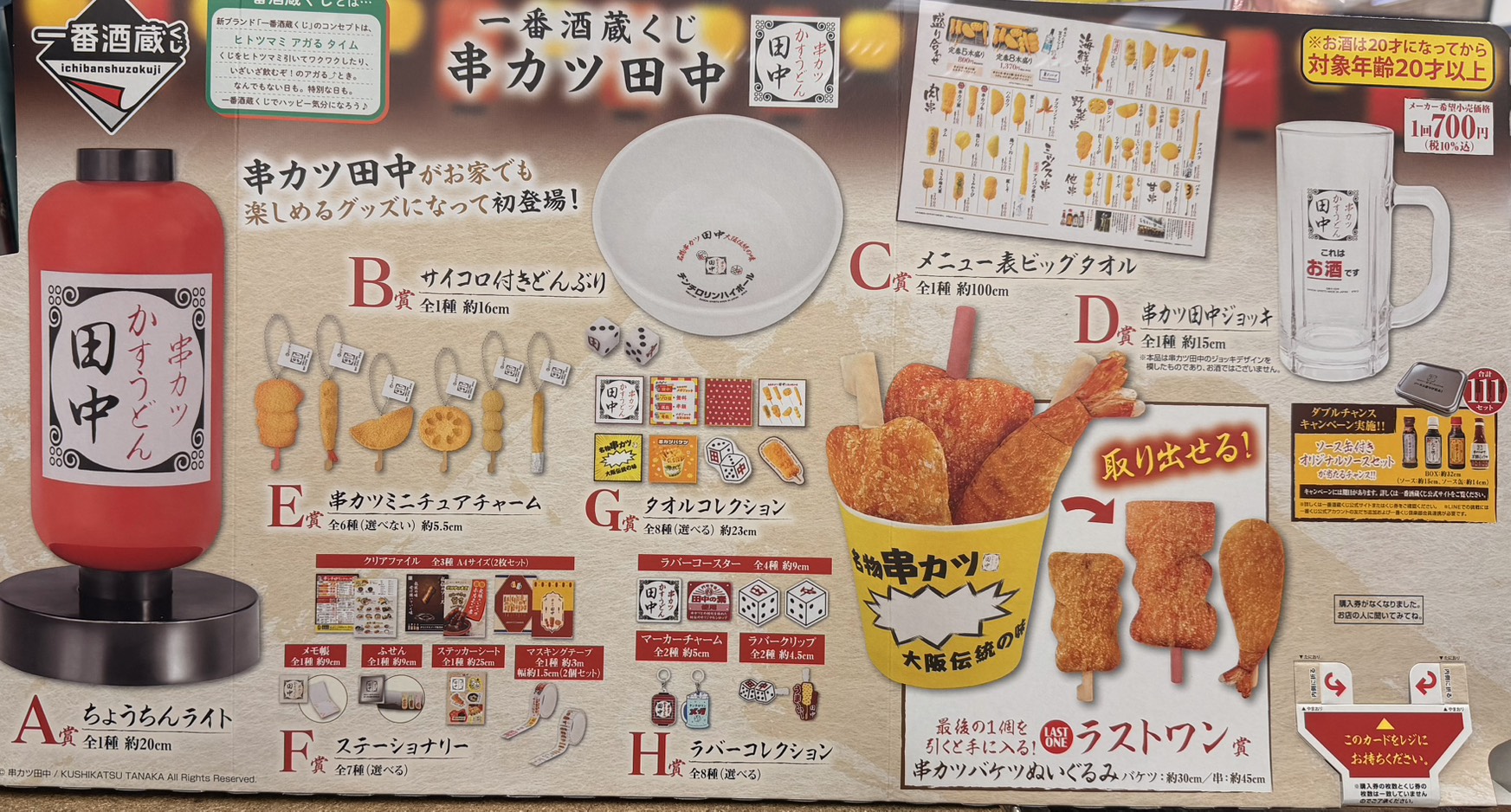明日、12月5日(金)発売の 1番酒蔵くじ ・串カツ田中🍖 入荷しました🌟 NEW おもちゃ 2025年12月4日 明日、12月5日(金)発売の1番酒蔵くじ ・串カツ田中🍖 入荷しました🌟 串カツ田中がお家でも楽しめるグッズになって初登場!! ちょうちんライトや串カツ田中ジョッキ ラストワン賞には、串カツバケツぬいぐるみ等などたくさんのグッズです☺️ 皆様のチャレンジお待ちしております🙇♀️❣️