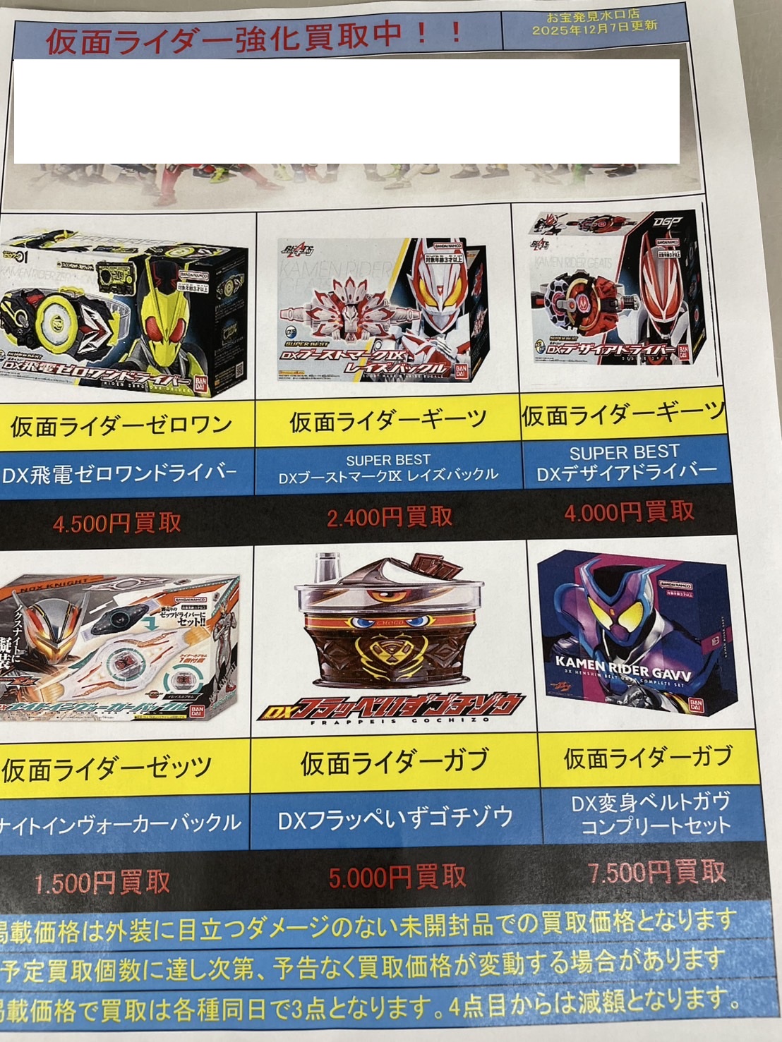 ◆仮面ライダー買取リストを更新しました!!◆ NEW 買取告知 おもちゃ 2025年12月8日 仮面ライダー買取リストを更新しました!! 是非当店買取へお持ちください!! ※2025/12/8現在の価格となります。 在庫状況などによってお値段が変動いたします。予めご了承ください。 ************************ こちら↓もぜひチェックしてみてくださいね♪(*´▽`*) ・最新のイベント情報はこちら ・最新の買取情報はこちら