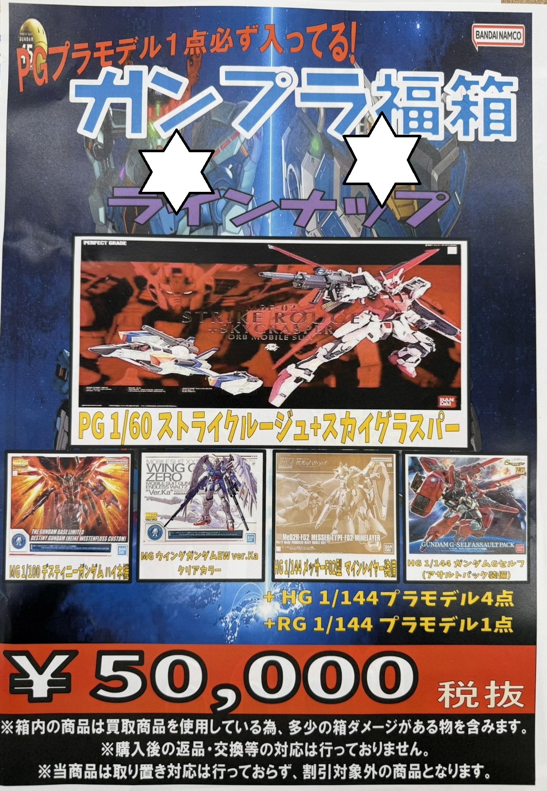 水口店おもちゃコーナーでは、2026年1月1日(木)午前10時より福袋を販売開始いたします! おもちゃ 2025年12月19日 水口店おもちゃコーナーでは、2026年1月1日(木)午前10時より福袋を販売開始いたします! 今回はワンピース・ドラゴンボール・仮面ライダー・少年誌・ガンプラ・ホロライブのラインナップを販売します! 各種なくなり次第終了の限定販売品ですので、ぜひお買い求めください! ※各種福袋の内容はSNS・店頭にて掲載します。 ※福袋商品は取り置き不可・割引対象外の商品となります。