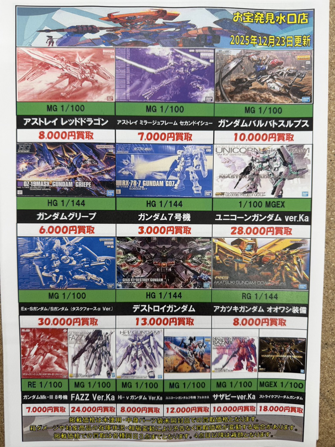 ★ガンプラ強化買取タイトル◦メタルビルド商品の買取価格を更新しました!★ NEW 買取告知 おもちゃ 2025年12月23日 ガンプラ強化買取タイトル◦メタルビルド商品の買取価格を更新しました! ぜひ当店買取までお持ち寄りください! ※2025/12/23現在の価格となります。 在庫状況などによってお値段が変動いたします。予めご了承ください。 ************************ こちら↓もぜひチェックしてみてくださいね♪(*´▽`*) ・最新のイベント情報はこちら ・最新の買取情報はこちら