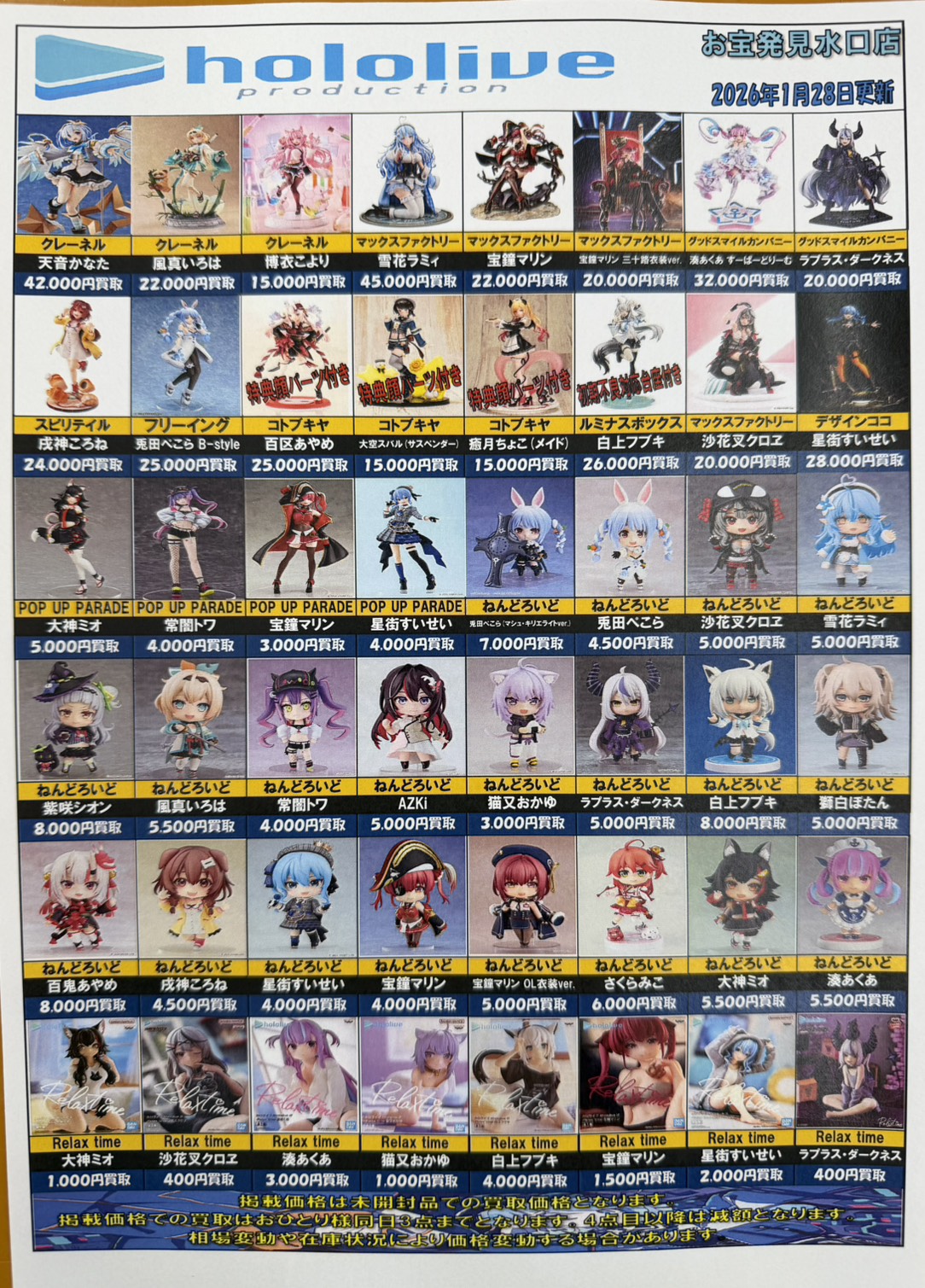 ホロライブフィギュアの買取価格を更新しました! 買取告知 おもちゃ 2026年1月28日 ホロライブフィギュアの買取価格を更新しました! ぜひ当店までお持ち寄りください! ※2026/1/28現在の価格となります。 在庫状況などによってお値段が変動いたします。予めご了承ください。 ************************ こちら↓もぜひチェックしてみてくださいね♪(*´▽`*) ・最新のイベント情報はこちら ・最新の買取情報はこちら