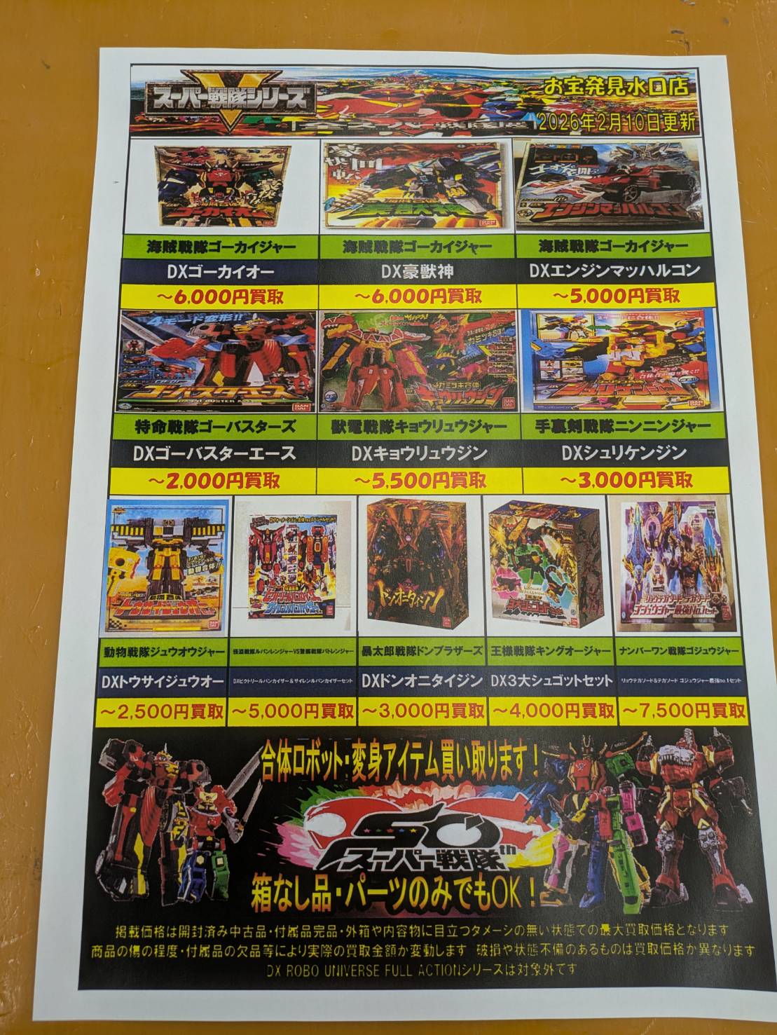 ◆スーパー戦隊買取リストを更新しました!!◆ NEW 買取告知 おもちゃ 2026年2月11日 スーパー戦隊買取リストを更新しました!! 是非当店買取へお持ちください!! ※2026/2/11現在の価格となります。 在庫状況などによってお値段が変動いたします。予めご了承ください。 ************************ こちら↓もぜひチェックしてみてくださいね♪(*´▽`*) ・最新のイベント情報はこちら ・最新の買取情報はこちら