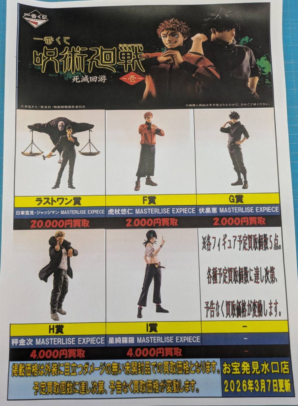◦一番くじ 呪術廻戦死滅回遊 壱 の買取リストを作成しました! 買取告知 おもちゃ 2026年3月7日 ◦一番くじ 呪術廻戦死滅回遊 壱 の買取リストを作成しました! ぜひ当店買取までお持ち寄りください! ※各種在庫が集まり次第強化買取は終了となります。 ※2026/3/7現在の価格となります。 在庫状況などによってお値段が変動いたします。予めご了承ください。 ************************ こちら↓もぜひチェックしてみてくださいね♪(*´▽`*) ・最新のイベント情報はこちら ・最新の買取情報はこちら