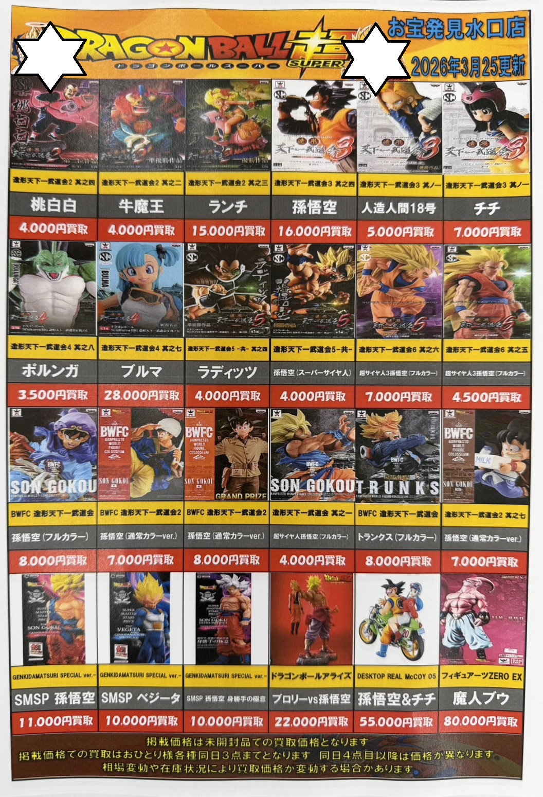 ドラゴンボールフィギュアの買取価格を更新しました! 買取告知 おもちゃ 2026年3月25日 ドラゴンボールフィギュアの買取価格を更新しました! ぜひ当店買取までお持ち寄りください! ※2026/3/25現在の価格となります。 在庫状況などによってお値段が変動いたします。予めご了承ください。 ************************ こちら↓もぜひチェックしてみてくださいね♪(*´▽`*) ・最新のイベント情報はこちら ・最新の買取情報はこちら