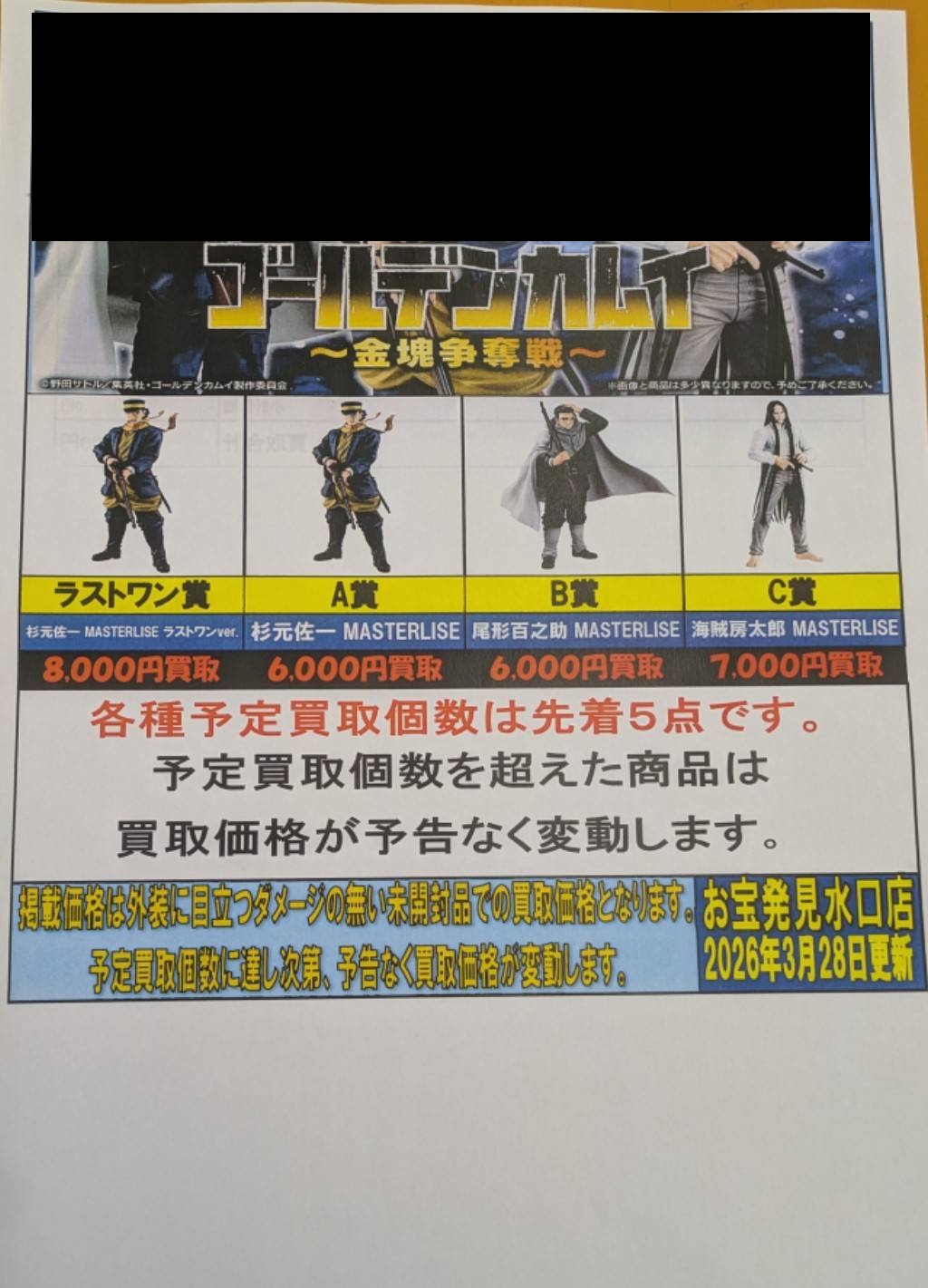 一番くじゴールデンカムイ〜金塊争奪戦〜 の強化買い取りリスト更新しました! 買取告知 おもちゃ 2026年3月28日 一番くじゴールデンカムイ〜金塊争奪戦〜 の強化買い取りリスト更新しました! ぜひ当店買取までお持ち寄りください! ※2026/3/28現在の価格となります。 在庫状況などによってお値段が変動いたします。予めご了承ください。 ************************ こちら↓もぜひチェックしてみてくださいね♪(*´▽`*) ・最新のイベント情報はこちら ・最新の買取情報はこちら