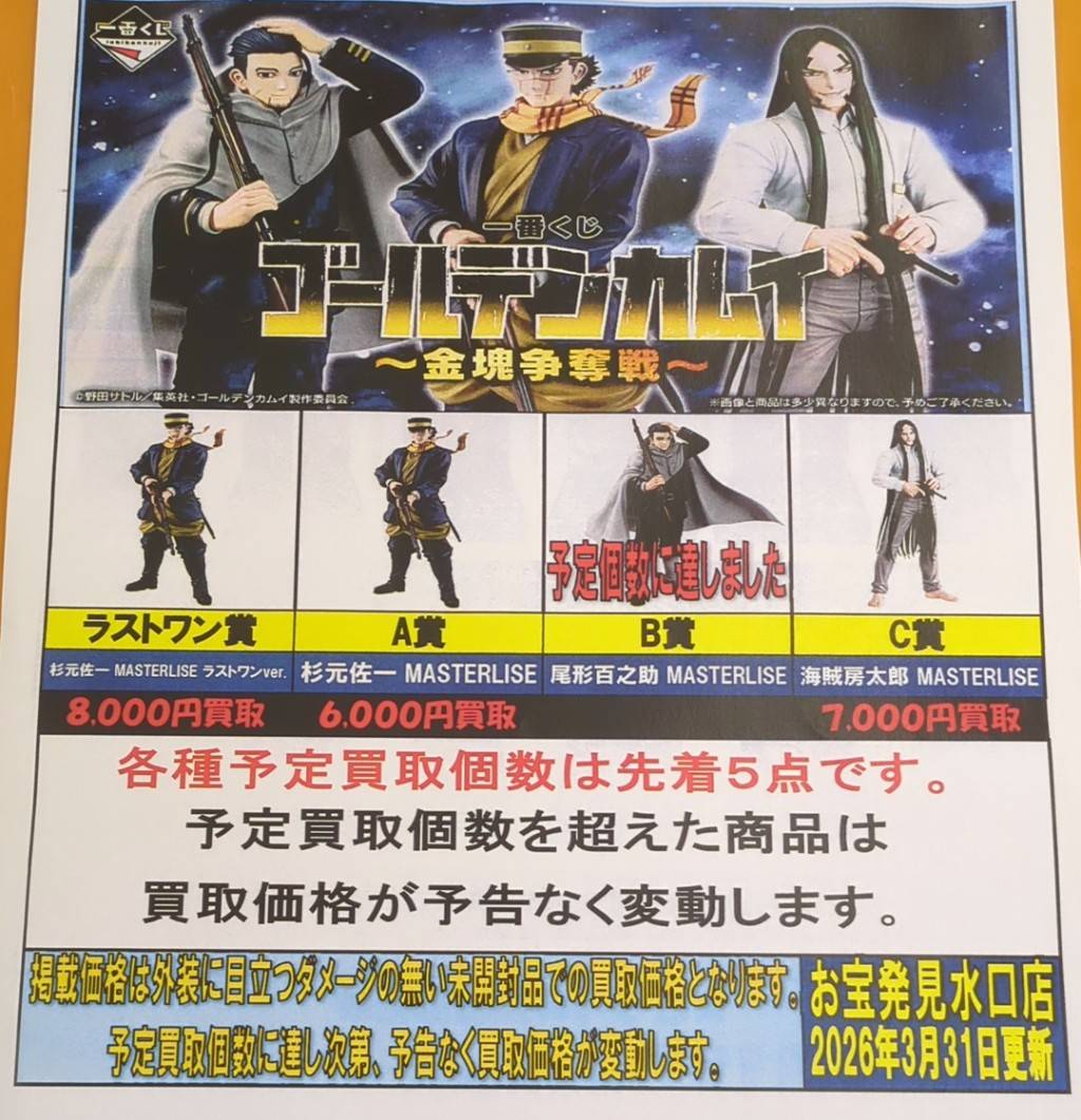一番くじゴールデンカムイ〜金塊争奪戦〜 の強化買い取りリスト更新しました! 買取告知 おもちゃ 2026年3月31日 一番くじゴールデンカムイ〜金塊争奪戦〜 の強化買い取りリスト更新しました! ぜひ当店買取までお持ち寄りください! ※2026/3/31現在の価格となります。 在庫状況などによってお値段が変動いたします。予めご了承ください。 ************************ こちら↓もぜひチェックしてみてくださいね♪(*´▽`*) ・最新のイベント情報はこちら ・最新の買取情報はこちら