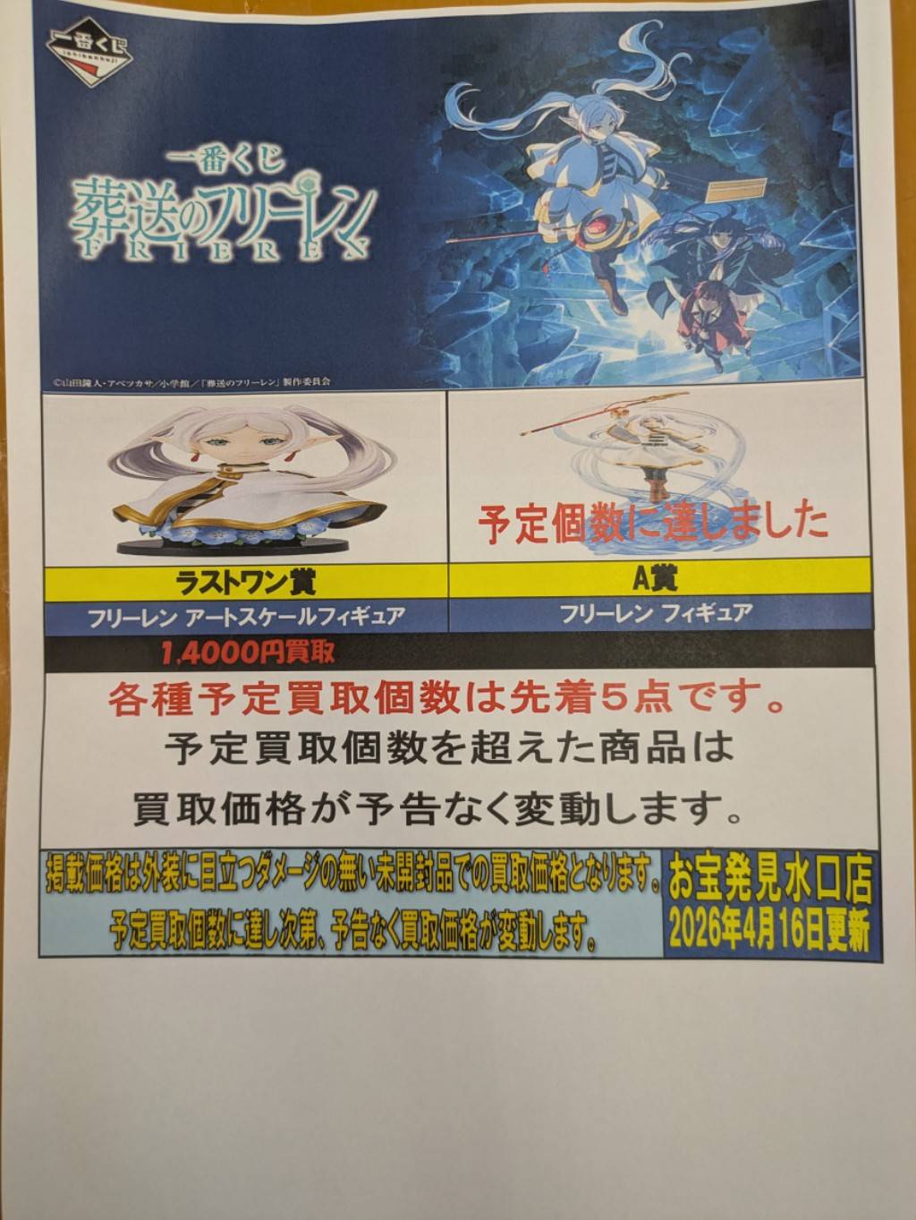 ★一番くじ葬送のフリーレン強化買い取りリスト更新しました!★ NEW 買取告知 おもちゃ 2026年4月16日 一番くじ葬送のフリーレン強化買い取りリスト更新しました! ※2026/4/16現在の価格となります。 在庫状況などによってお値段が変動いたします。予めご了承ください。 ************************ こちら↓もぜひチェックしてみてくださいね♪(*´▽`*) ・最新のイベント情報はこちら ・最新の買取情報はこちら