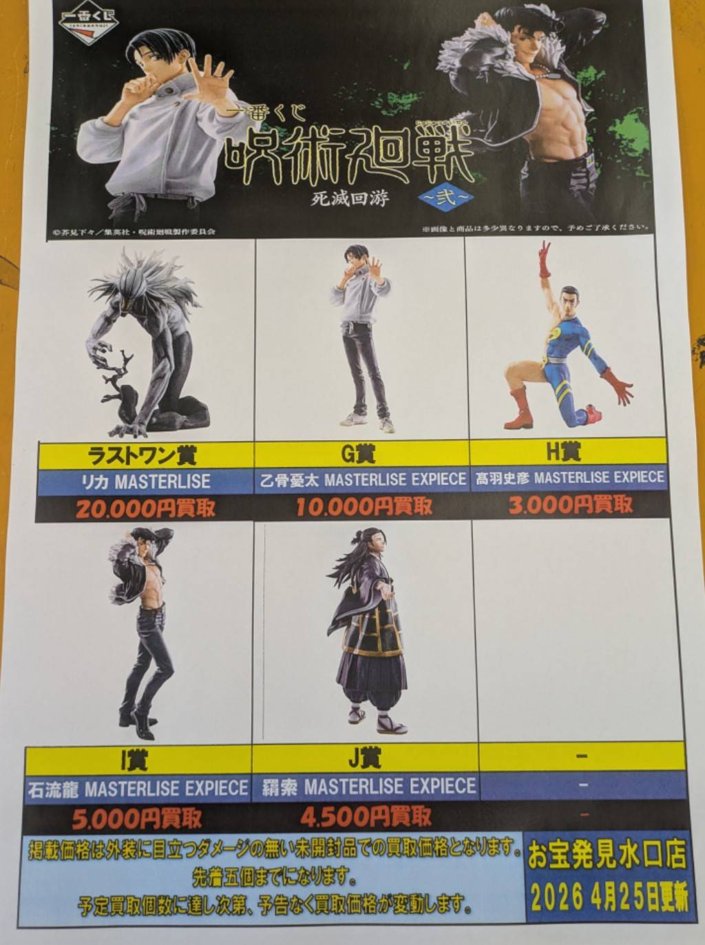 ◦一番くじ 呪術廻戦死滅回遊 弐の買取リストを作成しました! NEW 買取告知 おもちゃ 2026年4月25日 ◦一番くじ 呪術廻戦死滅回遊 弐の買取リストを作成しました! ぜひ当店買取までお持ち寄りください! ※各種在庫が集まり次第強化買取は終了となります。 ※2026/4/25現在の価格となります。 在庫状況などによってお値段が変動いたします。予めご了承ください。 ************************ こちら↓もぜひチェックしてみてくださいね♪(*´▽`*) ・最新のイベント情報はこちら ・最新の買取情報はこちら