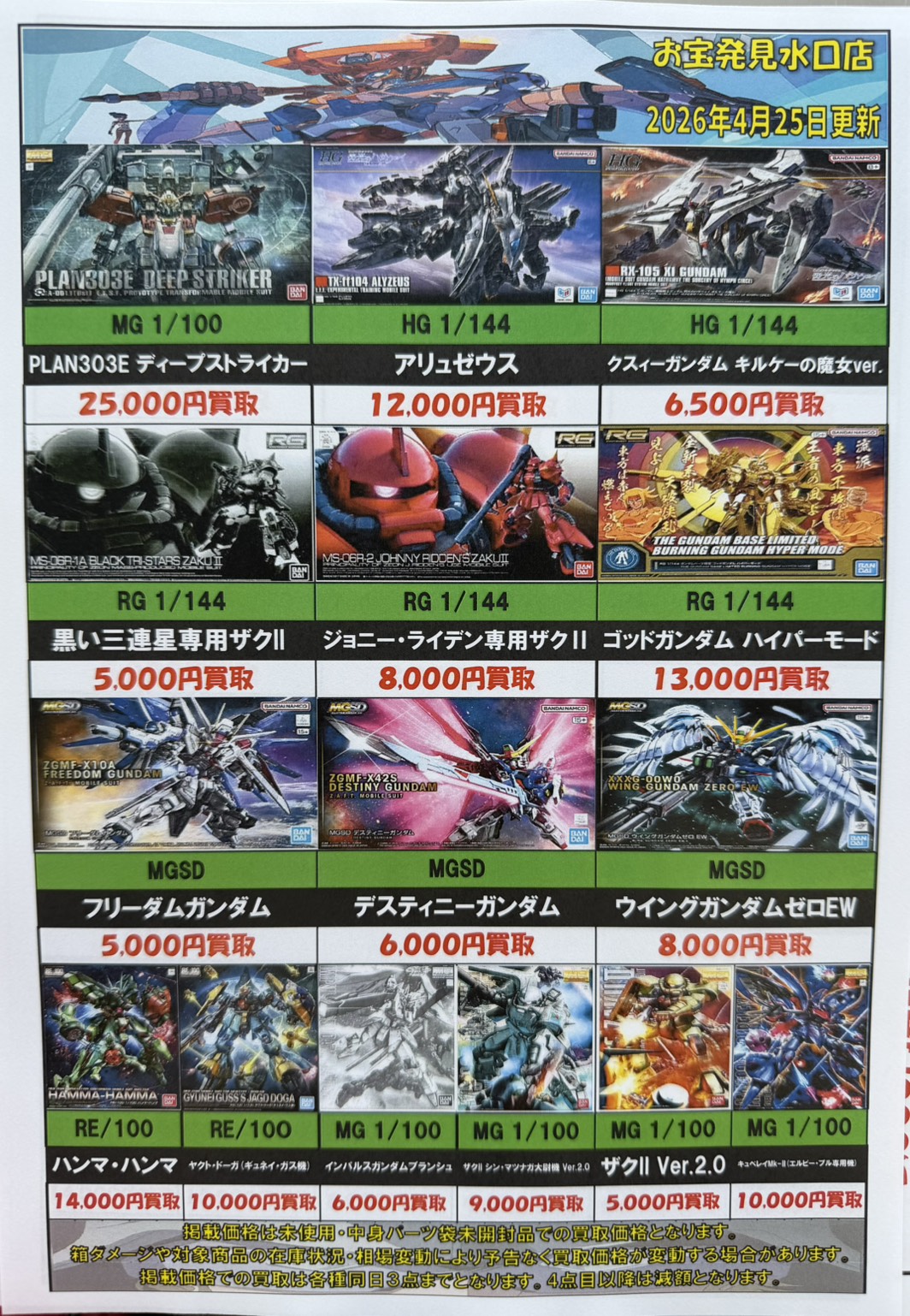 ガンプラ強化買取タイトルを更新しました! 買取告知 おもちゃ 2026年4月25日 ガンプラ強化買取タイトルを更新しました! 本日発売のHG 1/144 アリュゼウスも高価買取します! ぜひ当店買取までお持ち寄りください! ※2026/4/25現在の価格となります。 在庫状況などによってお値段が変動いたします。予めご了承ください。 ************************ こちら↓もぜひチェックしてみてくださいね♪(*´▽`*) ・最新のイベント情報はこちら ・最新の買取情報はこちら