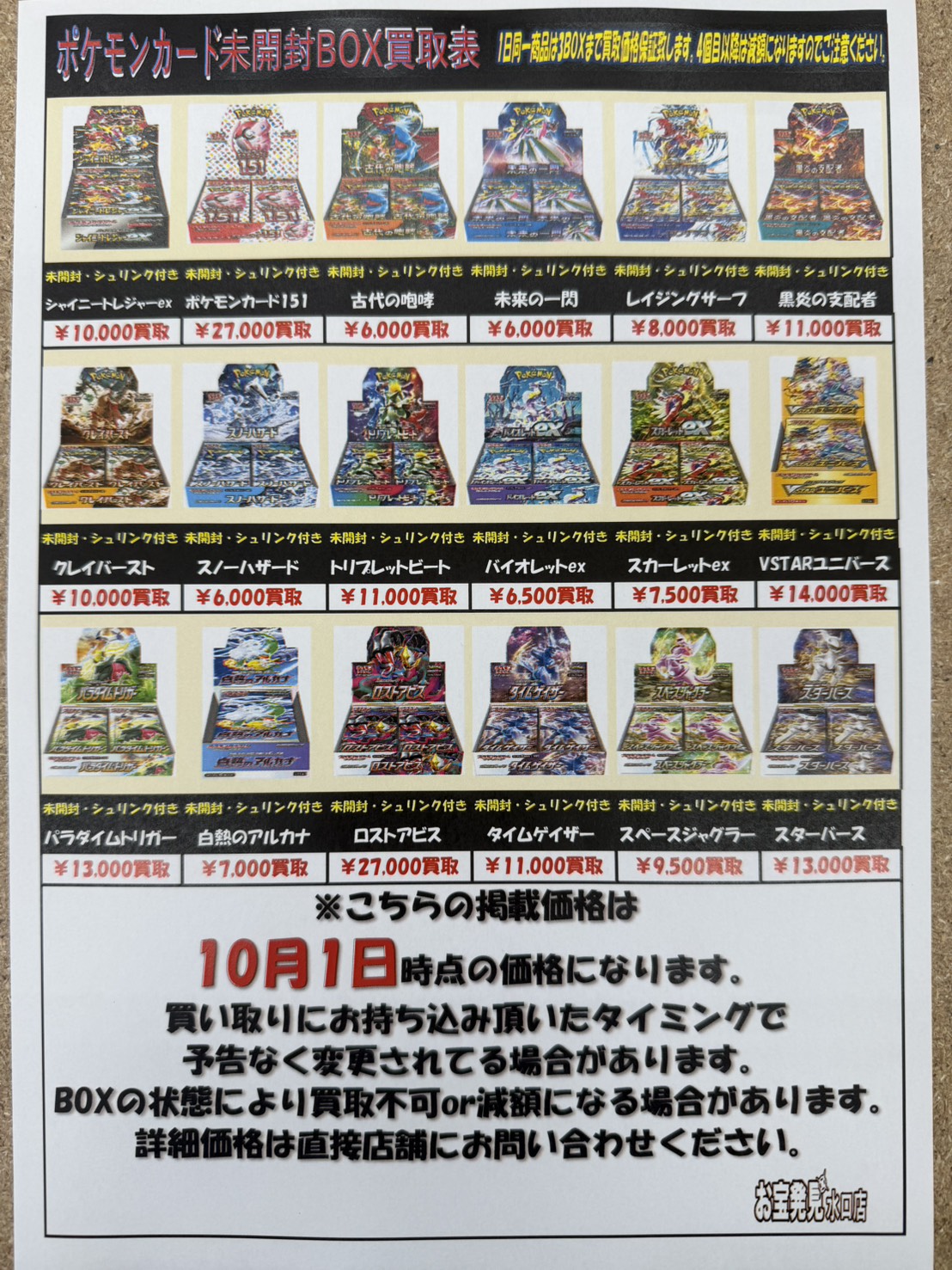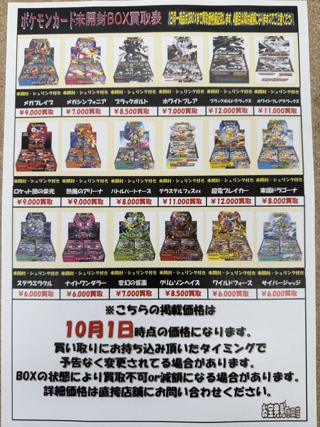 ポケモンカードカードBOX買取リスト更新しました! 買取告知 カード 2025年10月1日 個数が集まり次第掲載価格は終了します。 お早めにお持ち下さいませ! 当店査定基準に満たない商品は買取不可となります。 ※2025/10/1現在の価格となります。 在庫状況などによってお値段が変動いたします。予めご了承ください。 ************************ こちら↓もぜひチェックしてみてくださいね♪(*´▽`*) ・最新のイベント情報はこちら ・最新の買取情報はこちら