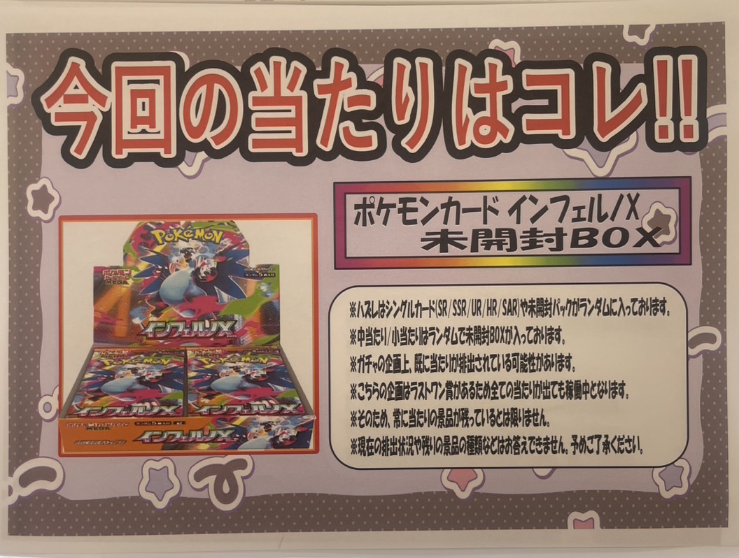 ■売り切れてました 『ポケカUNLOCKロッカーガチャ』 景品補充を行いました❗️■ カード ガチャ 2025年10月5日 売り切れてました 『ポケカUNLOCKロッカーガチャ』 景品補充を行いました❗️ 今回の当たりは 「インフェルノX 未開封BOX」 ラストワンには 「レシラムex SAR 168/086」 をご用意してます! ハズレにはシングルカードが入ってます! ぜひこの機会にチャレンジしに来てください!