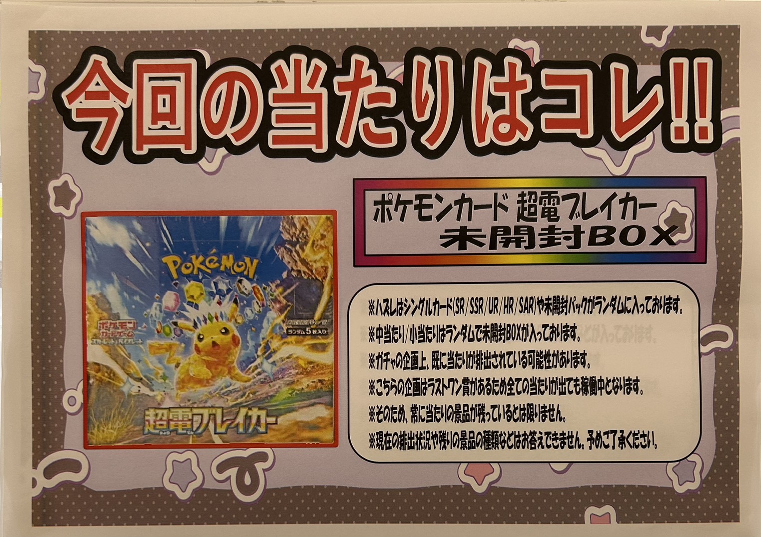 売り切れてました 『ポケカUNLOCKロッカーガチャ』 景品補充を行いました❗️ カード ガチャ 2025年10月18日 売り切れてました 『ポケカUNLOCKロッカーガチャ』 景品補充を行いました❗️ 今回の当たりは 「超電ブレイカー 未開BOX」 ラストワンには 「メガシンフォニア ポケモンセンターセット 未開封」 をご用意してます! ハズレにはシングルカードや パックが入ってます! ぜひこの機会に チャレンジしに来てください!
