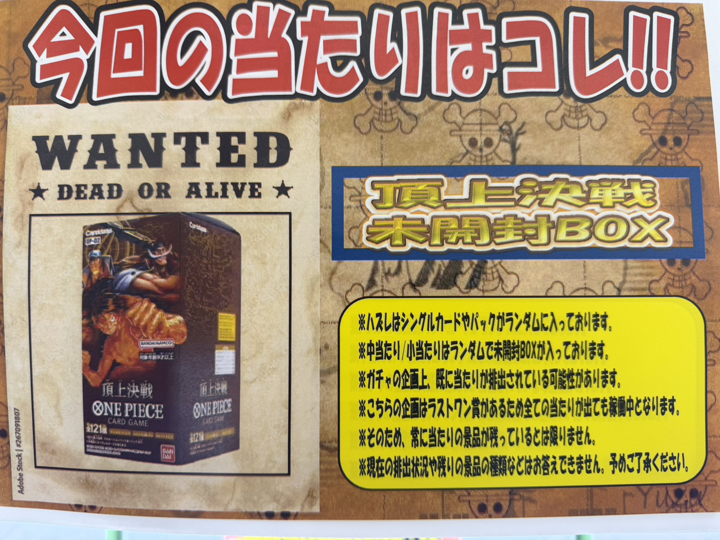 売り切れてました ワンピースロッカーガチャ 景品更新致しました!😸 カード ガチャ 2025年10月20日 売り切れてました ワンピースロッカーガチャ景品更新致しました!😸 今回の大当たりは 「頂上決戦 未開封BOX」です😻 ラストワンに 「新時代の主役 未開封BOX」です😽✨ ハズレにはシングルカードやパックが入ってます! ぜひこの機会にチャレンジしに来てください!
