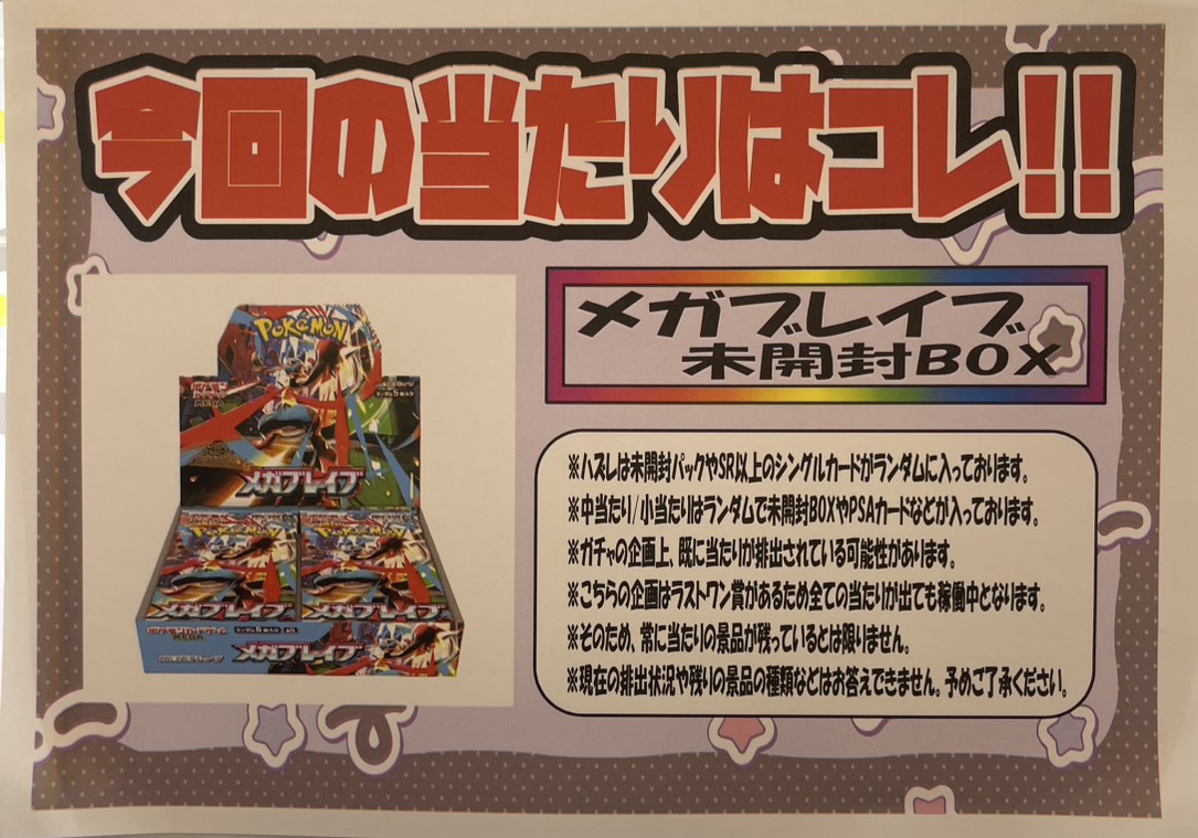 売り切れてました 『ポケカUNLOCKロッカーガチャ』 景品補充を行いました❗️ カード ガチャ 2025年10月20日 売り切れてました 『ポケカUNLOCKロッカーガチャ』景品補充を行いました❗️ 今回の大当たりは 「メガブレイブ 未開封BOX」 ラストワンに 「タロ SAR 131/102 PSA10」 をご用意してます! ハズレにはシングルカードやパックが入ってます! ぜひこの機会にチャレンジしに来てください!