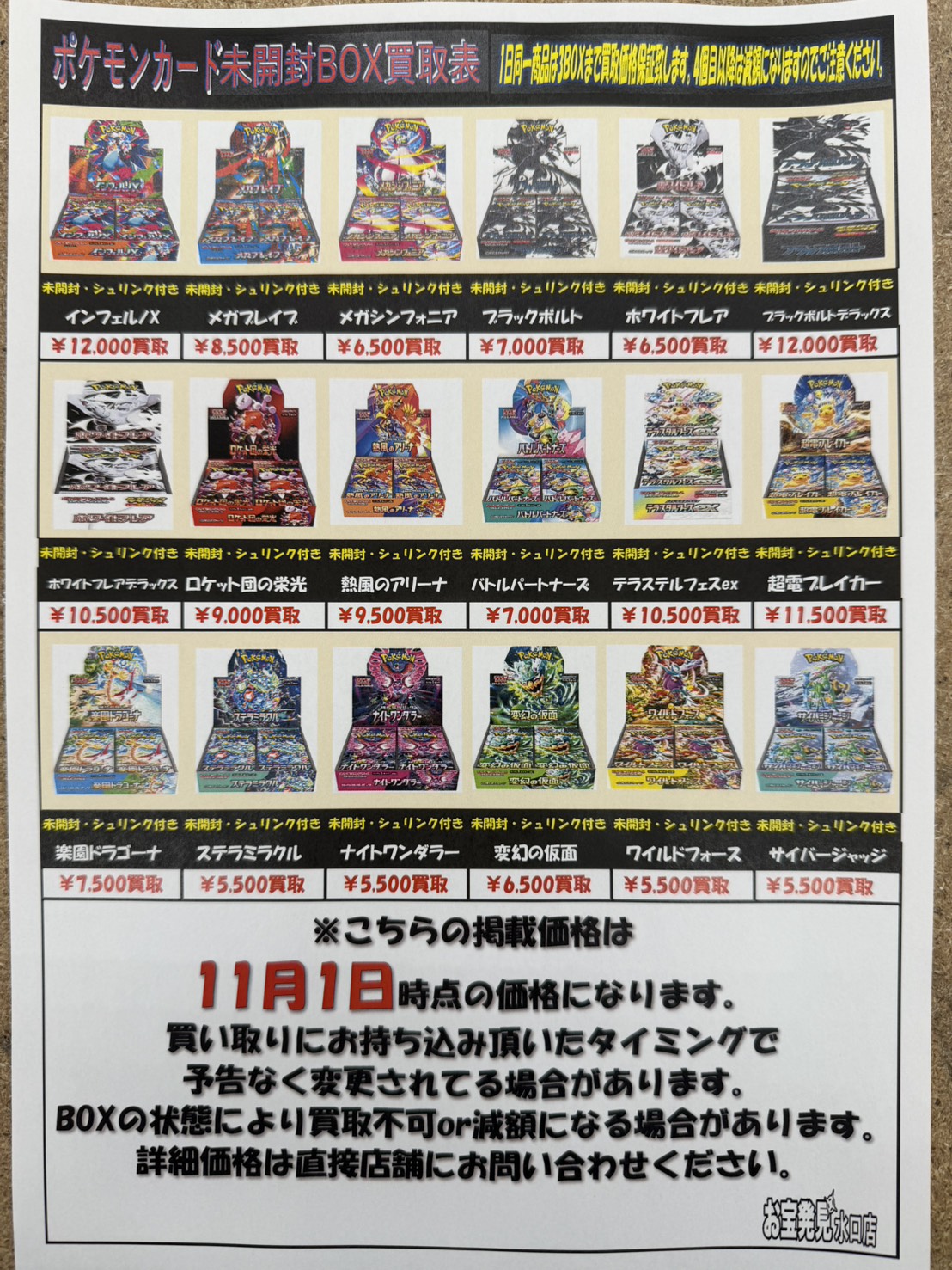 ポケモンカードカードBOX買取リスト更新しました! NEW 買取告知 カード 2025年10月31日 個数が集まり次第掲載価格は終了します。 お早めにお持ち下さいませ! 当店査定基準に満たない商品は買取不可となります。 ※2025/10/31現在の価格となります。 在庫状況などによってお値段が変動いたします。予めご了承ください。 ************************ こちら↓もぜひチェックしてみてくださいね♪(*´▽`*) ・最新のイベント情報はこちら ・最新の買取情報はこちら