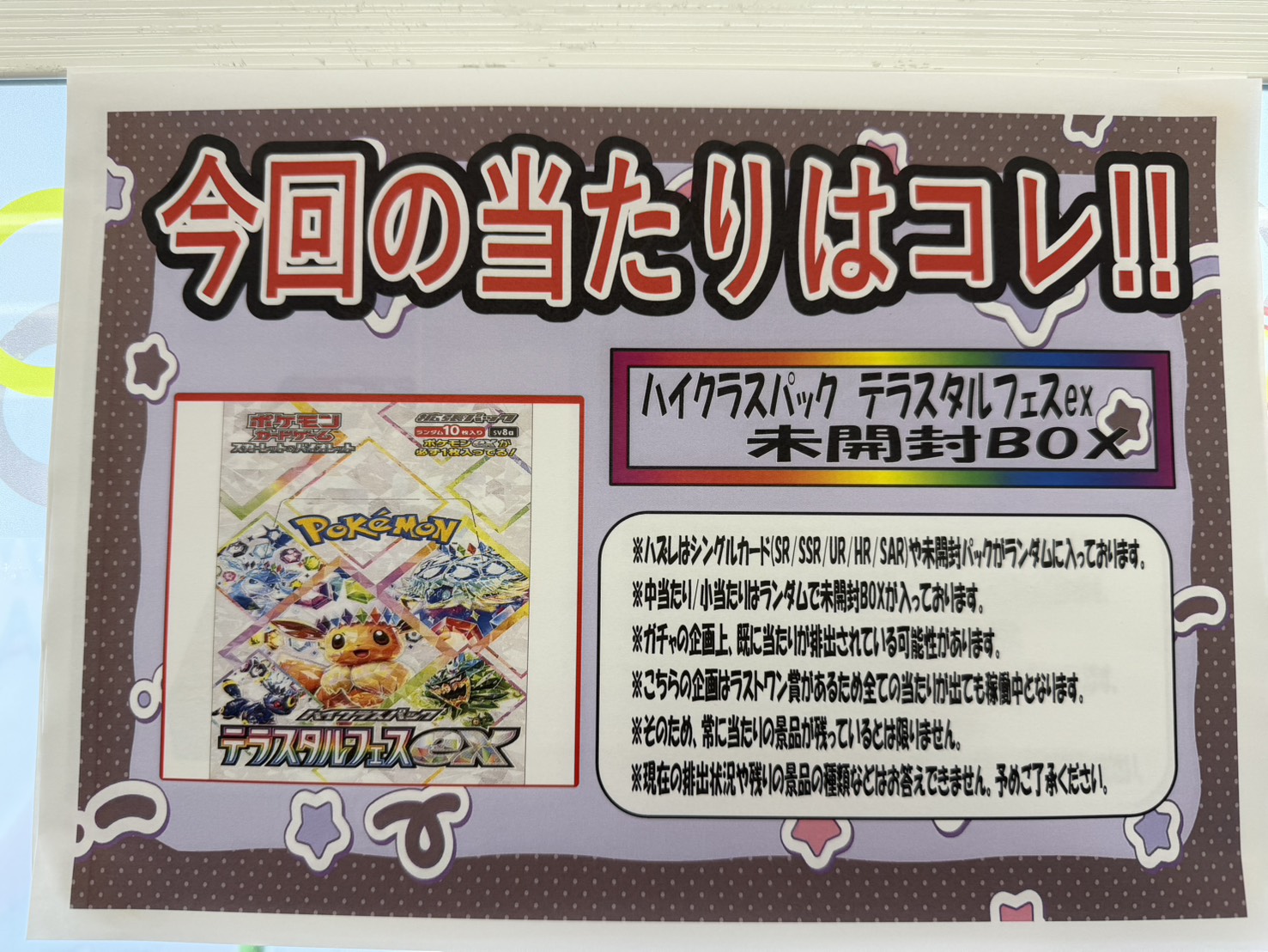 ポケカUNLOCKロッカーガチャ』 景品補充を行いました❗️ カード ガチャ 2025年11月3日 ポケカUNLOCKロッカーガチャ 景品補充を行いました❗️ 今回の当たりは 「テラスタルフェス 未開封BOX」 ラストワンには 「ナツメの暗示SR PSA10」 をご用意してます! ハズレにはシングルカードや パックが入ってます! ぜひこの機会に チャレンジしに来てください!