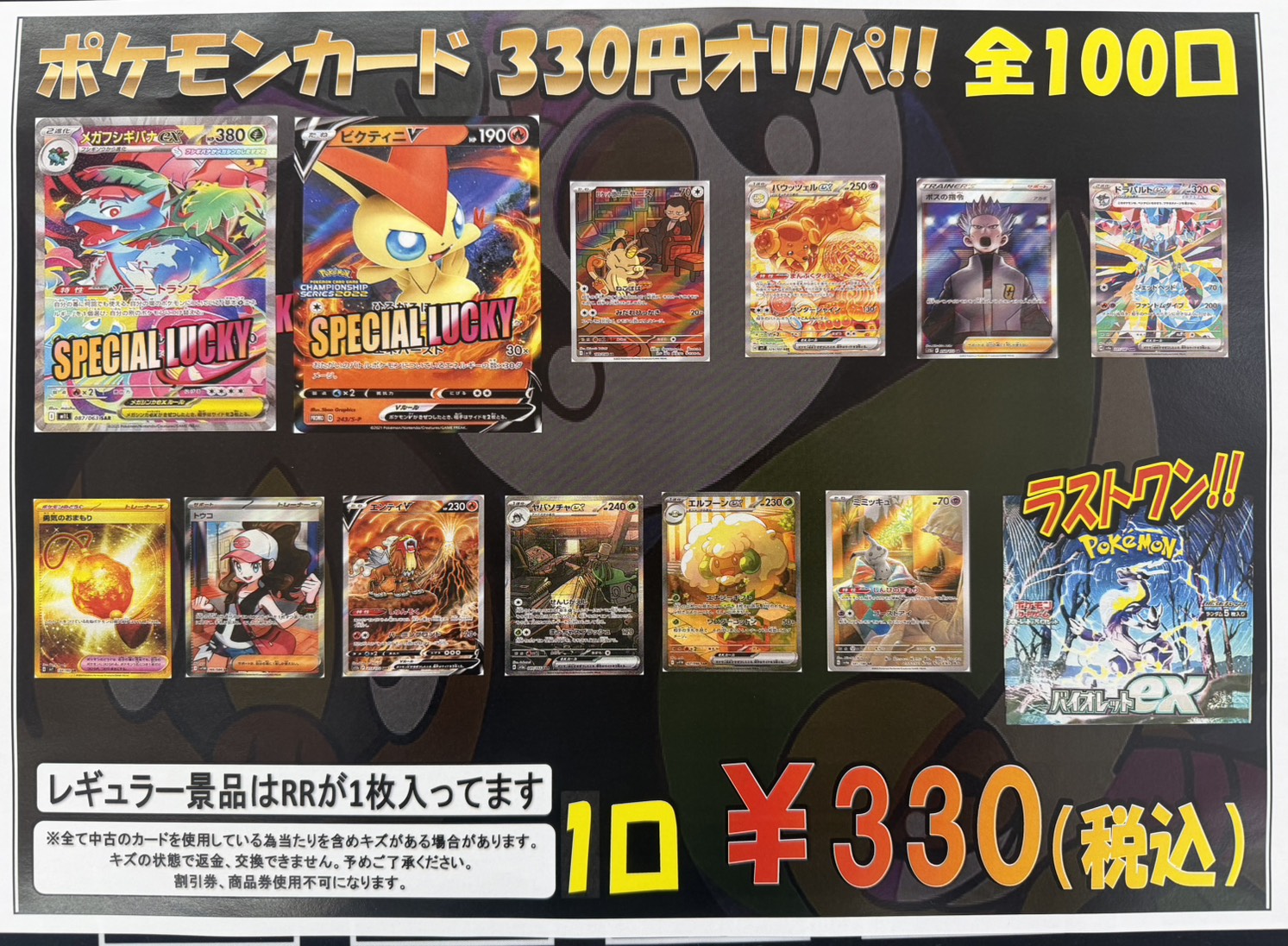 ポケモンカード330円 オリパ登場しました。 カード 2025年11月3日 ポケモンカード330円オリパ登場しました。 ラストワンに バイオレットex未開封BOX 大当たりにフシギバナex ビクティニなどが当たります🎯 是非チャレンジしてみて下さい!