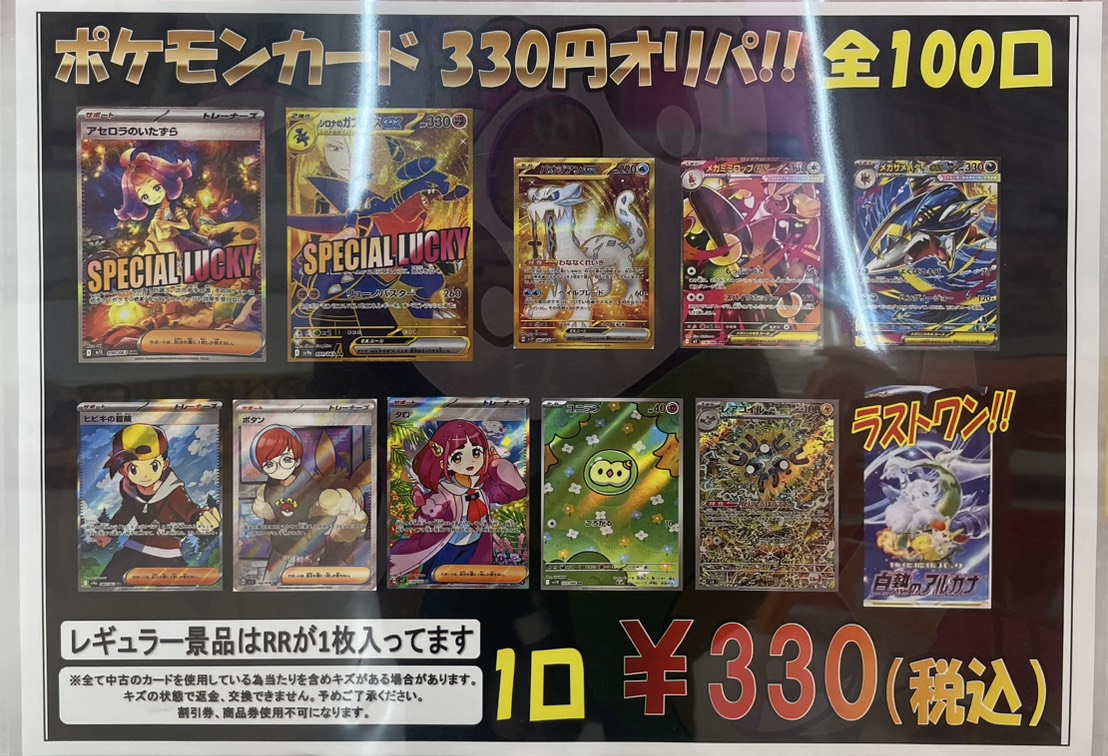 売れ切れていましたポケモンカード330円オリパ補充しました! カード ガチャ 2025年11月6日 売れ切れていましたポケモンカード330円オリパ補充しました! ラストワンに 白熱のアルカナ 未開封BOX 大当たりにアセロラのいたずら SAR シロナのガブリアスexなどが 当たります🎯 是非チャレンジしてみて下さい!