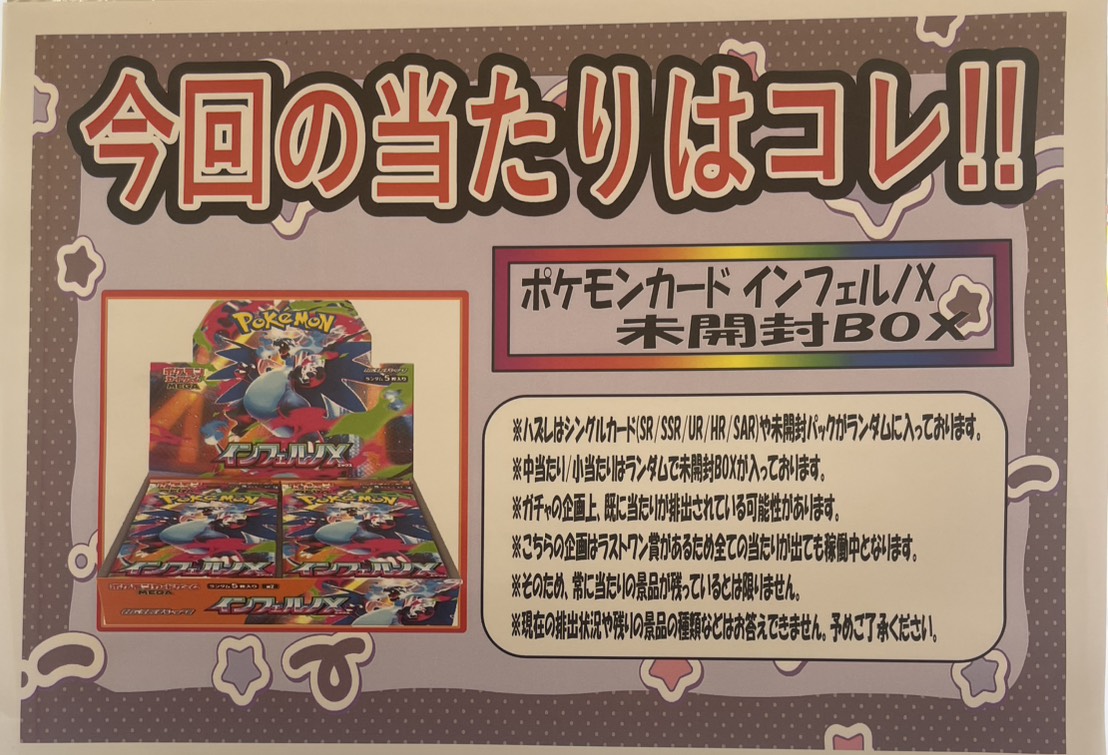 ★ポケカUNLOCKロッカーガチャ 景品補充しました!★ カード ガチャ 2025年11月25日 売り切れてました 『ポケカUNLOCKロッカーガチャ』 景品補充を行いました❗️ 今回の当たりは 「インフェルノX 未開封BOX」 ラストワンには 「スペシャルBOX ポケモンセンター トウホク 未開封BOX」 をご用意してます! ハズレには各種パックや シングルカードが入ってます! ぜひこの機会に チャレンジしに来てください!