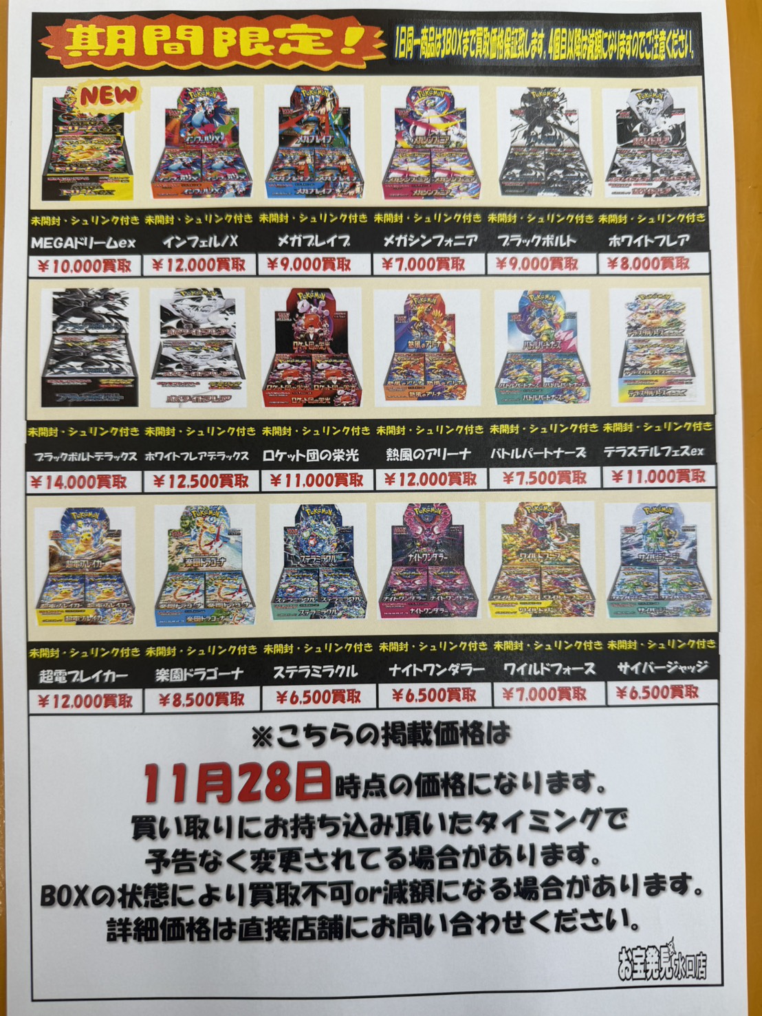 ポケモンカードカードBOX買取リスト更新しました! NEW 買取告知 カード 2025年11月28日 MEGAドリームex 買取お待ちしております! 1日おひとり様3BOXまで 4BOX以降は減額になります。 シュリンク、箱の状態に より買い取りを承れない 場合がございます。 予めご了承ください。 ※2025/11/28現在の価格となります。 在庫状況などによってお値段が変動いたします。予めご了承ください。 ************************ こちら↓もぜひチェックしてみてくださいね♪(*´▽`*) ・最新のイベント情報はこちら ・最新の買取情報はこちら