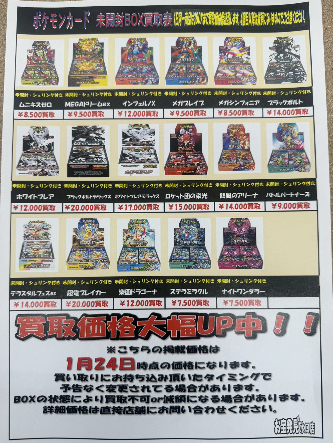 ポケモンカードカードBOX買取リスト更新しました! NEW 買取告知 カード 2026年1月24日 数量限定で買取価格大幅UP中!! 個数が集まり次第掲載価格は終了します。 お早めにお持ち下さいませ! 当店査定基準に満たない商品は買取不可となります。 ※2026/1/24現在の価格となります。 在庫状況などによってお値段が変動いたします。予めご了承ください。 ************************ こちら↓もぜひチェックしてみてくださいね♪(*´▽`*) ・最新のイベント情報はこちら ・最新の買取情報はこちら