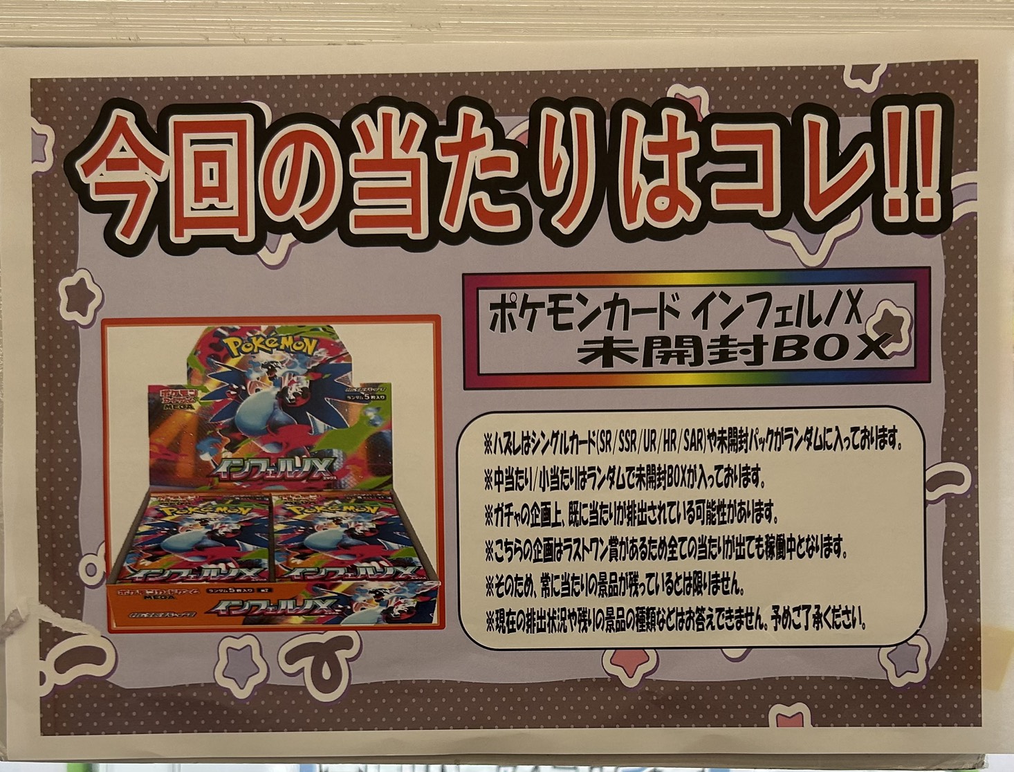 売り切れてました 『ポケカUNLOCKロッカーガチャ』 景品補充を行いました❗️ カード ガチャ 2026年1月30日 売り切れてました 『ポケカUNLOCKロッカーガチャ』 景品補充を行いました❗️ 今回の当たりは 「インフェルノX 未開封BOX」 ラストワンには 「ブラッキー(YU NAGABA) 067/SV-P」 をご用意してます! 各種パックやシングルカードが入ってます! ぜひこの機会にチャレンジしに来てください!