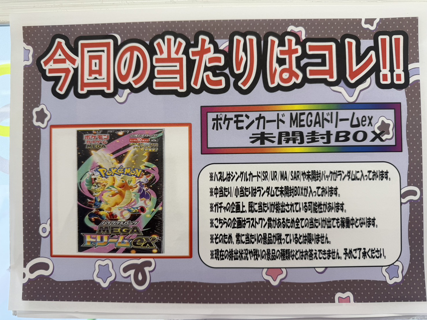売り切れてました 『ポケカUNLOCKロッカーガチャ』 景品補充を行いました❗️ カード ガチャ 2026年2月7日 売り切れてました 『ポケカUNLOCKロッカーガチャ』 景品補充を行いました❗️ 今回の当たりは 「MEGAドリームex未開封BOX」 ラストワンには 「メガカイリュー MUR」 をご用意してます! ハズレには各種パックやシングルカードが入ってます! ぜひこの機会にチャレンジしに来てください!